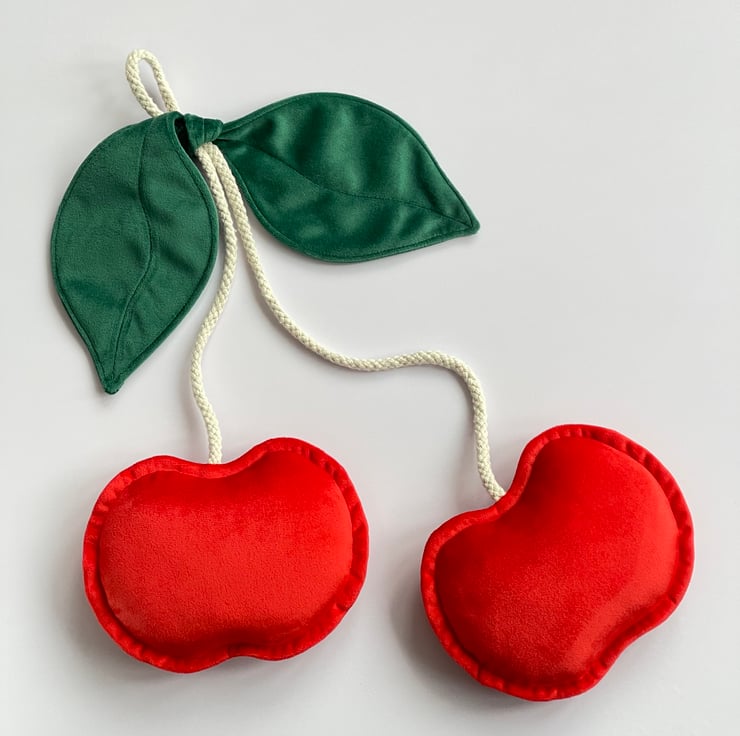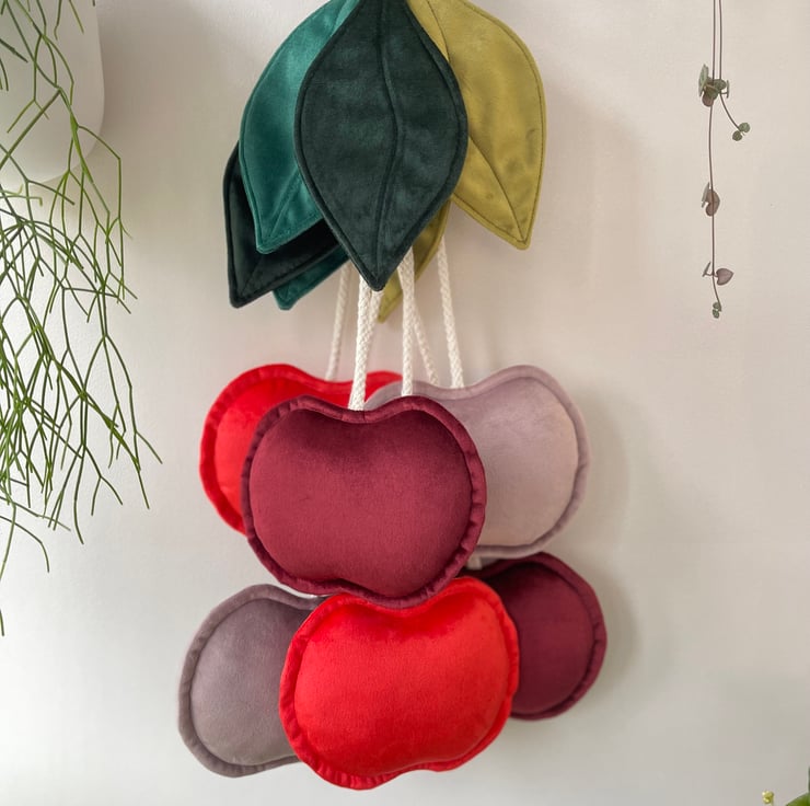 Each set features two oversized cherries made from soft velvet, connected by a natural cotton cord that enhances the organic, rustic feel. The cherries are complemented by beautifully crafted emerald green leaves, giving your decor a nature-inspired elegance.