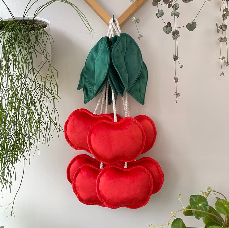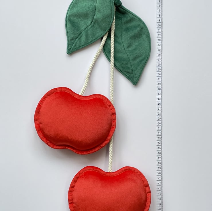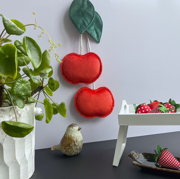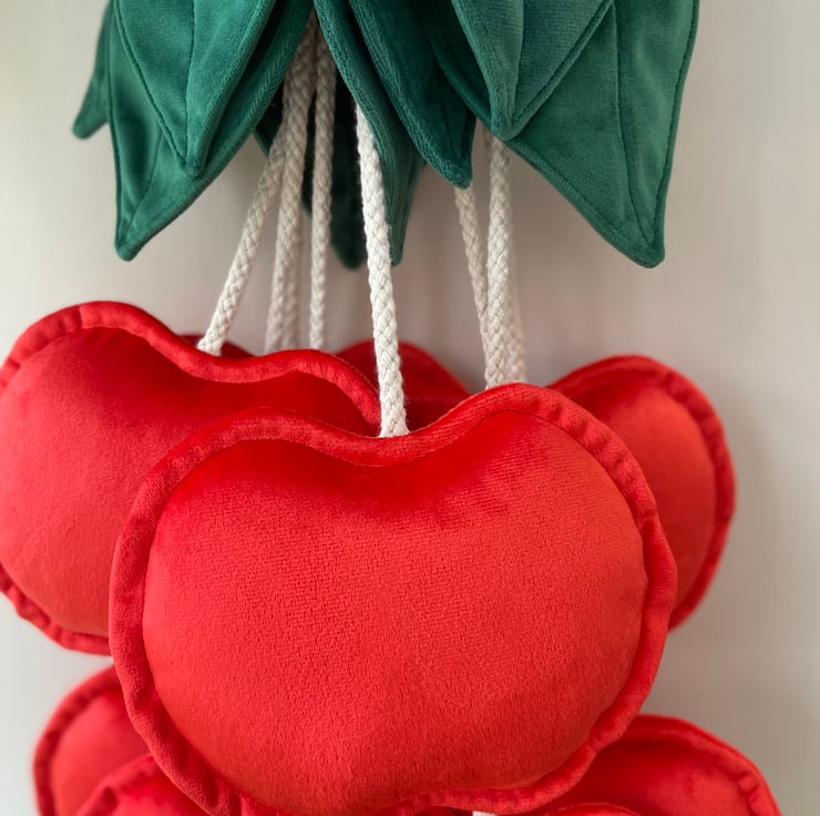 Red Velvet Cherries with Emerald Green Leaves Wall Hanging Fruit Nursery Decor