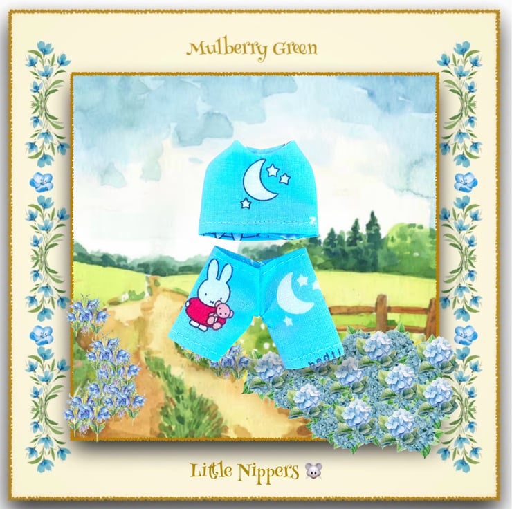 Tiny bunny print pyjamas made specially to fit the young Pip Squeaks. The pyjamas fasten at the back with a popper.