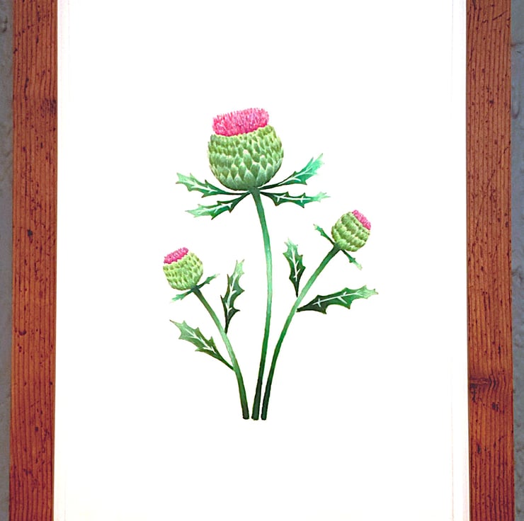 Framed high-quality coloured A3 print of my painting of purple/pink thistles on a white background with a hard backing. The print comes finished with a contemporary white border. Framed with an expensive Styrene Protective Perspex (which has same clarity of glass) ready to hang. Choose from three different types of frame; black, oak or dark oak(see images). Colours of print and border may differ slightly due to computer/phone settings. All purchases delivered within 7-10 working days.
