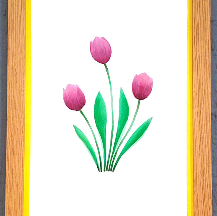 Framed high-quality coloured A3 print of my painting of purple tullips on a white background with a hard backing. The print comes finished with a vibrant yellow border. Framed with an expensive Styrene Protective Perspex (which has same clarity of glass) ready to hang. Choose from three different types of frame; black, oak or dark oak(see images). Colours of print and border may differ slightly due to computer/phone settings. All purchases delivered within 7-10 working days.