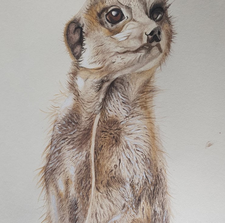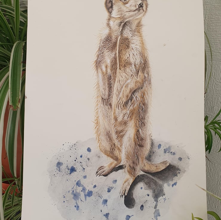 Mixed media (acrylic and watercolour) of a lovely, charismatic meerkat. Painted from a photograph taken in person. Can be framed if required, or will be posted backed on card to maintain its condition.