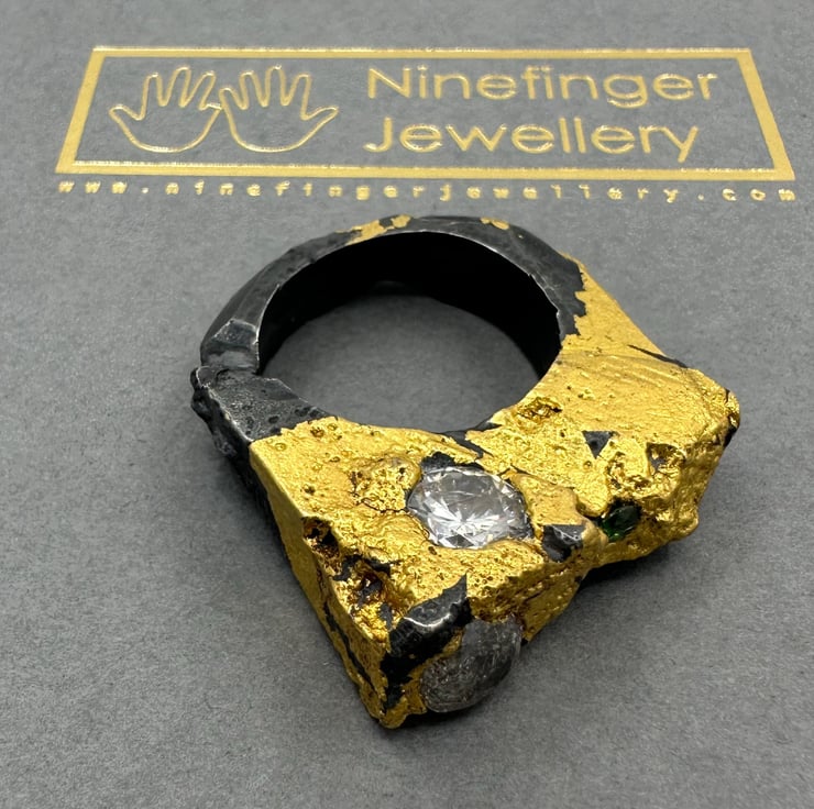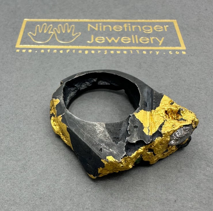 Designed to look like a part-crystalline object hewn from rock with a chisel and an axe, this is very much a statement ring, a conversation-starter. These unisex heavy chunky rings are sand-cast in Sterling silver, with multiple gemstones embedded in the cast metal, parts of the surface gilded with 24ct gold leaf, and with selected areas of silver oxidised to black.