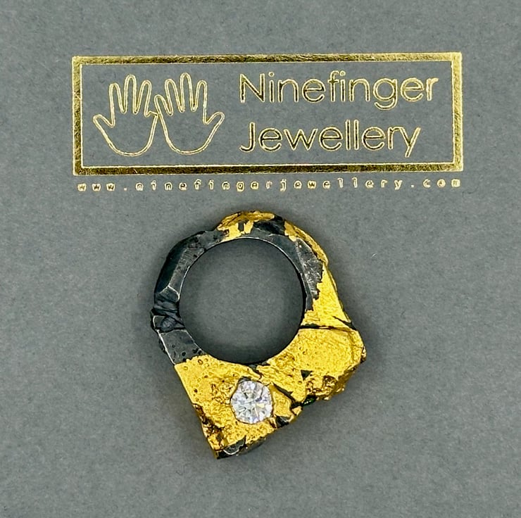 Due to random variations in the casting process and the gilding, each of these rings is unique; no two of them are entirely identical. As the ring is worn and ages, on prominent edges/surfaces of the ring, some of the black oxidised metal will be worn back to raw silver; and some of the gold leaf will similarly be eroded away revealing the Sterling beneath.