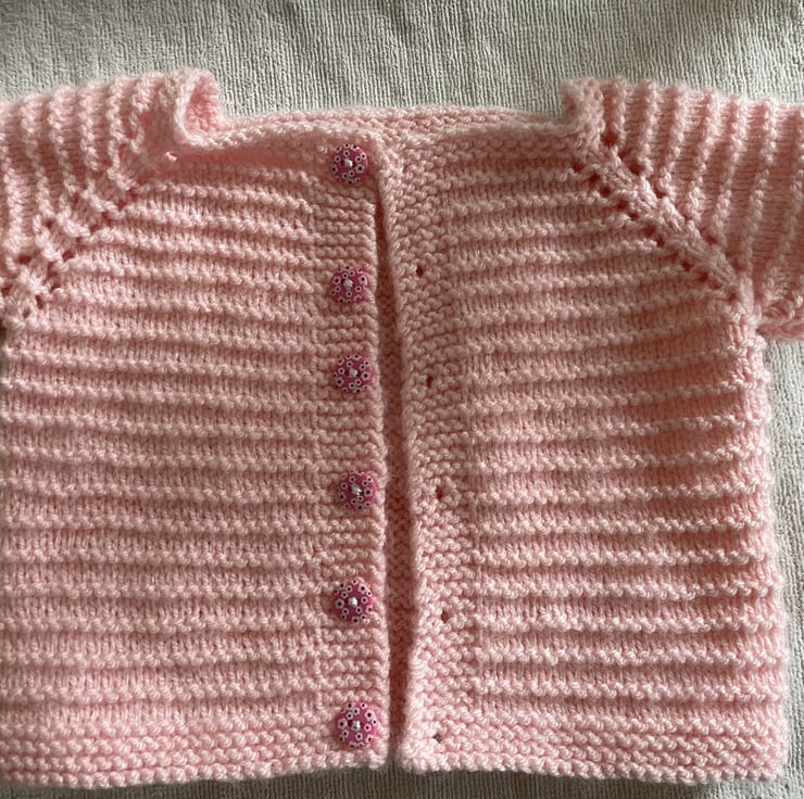 This charming baby girl short sleeve cardigan for age 6-7 months is made with 100% acrylic yarn. It also features 6 flower patterned buttons. Machine wash as wool.