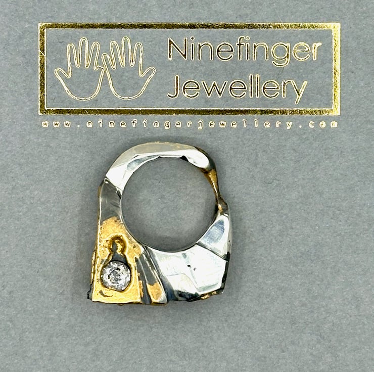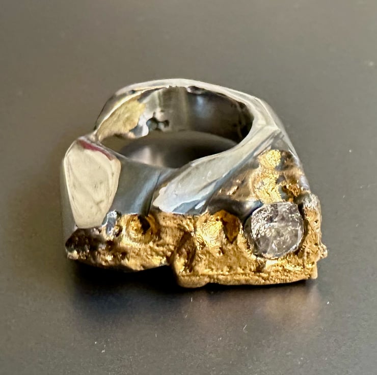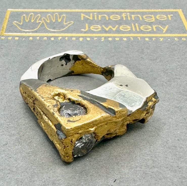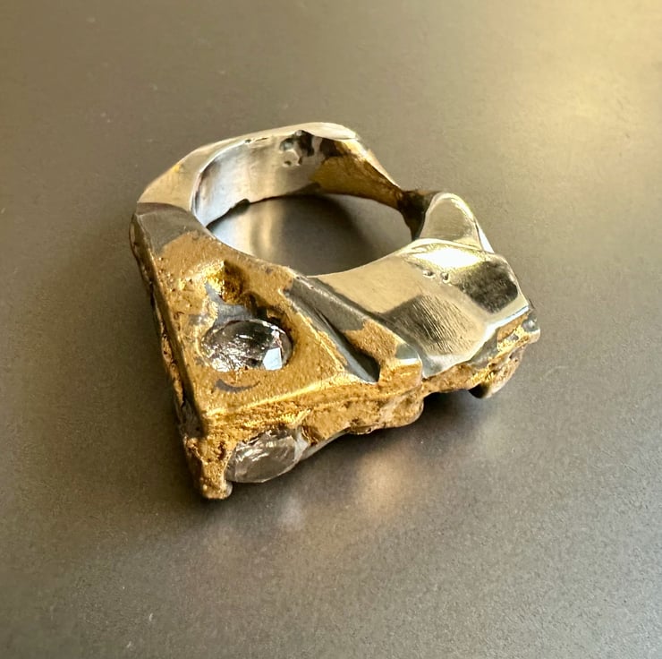 Designed to look like a part-crystalline object hewn from rock with a chisel and an axe, this is very much a statement ring, a conversation-starter. These unisex heavy chunky rings are sand-cast in Sterling silver, with multiple gemstones embedded in the cast metal, parts of the surface gilded with 24ct gold leaf, and with selected areas of silver oxidised to black.
