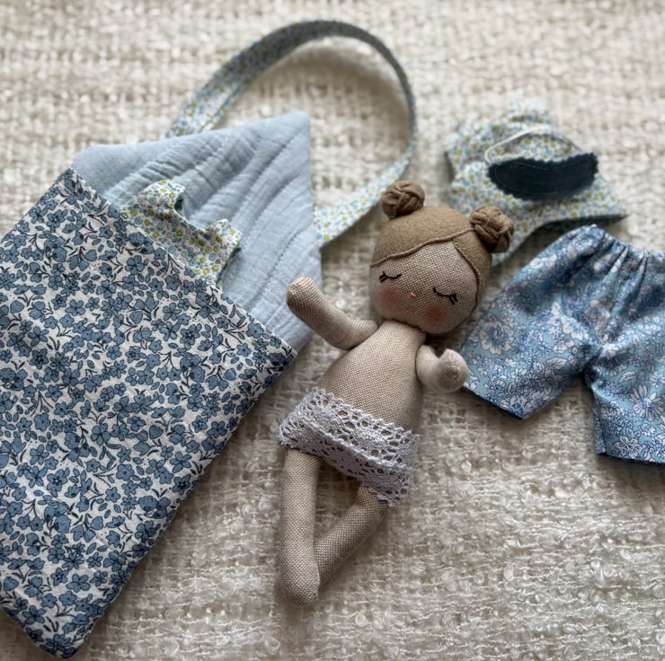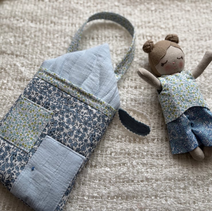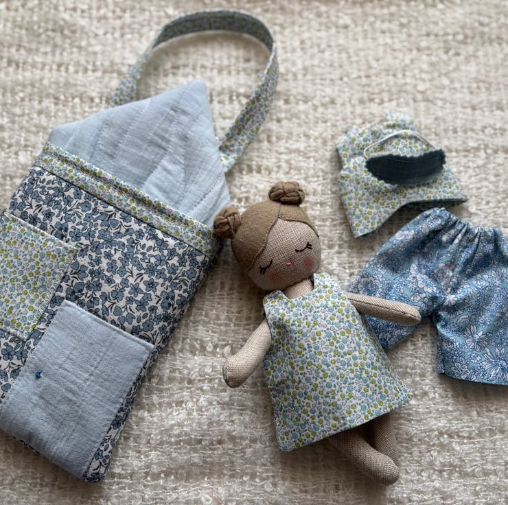 Handmade quilted dolls house bag with mini rag doll and outfits