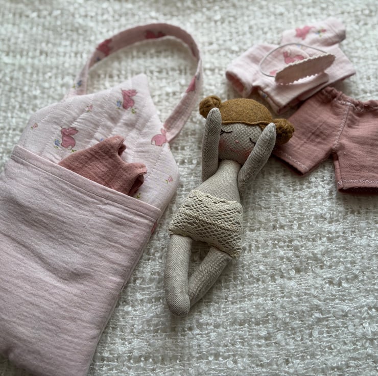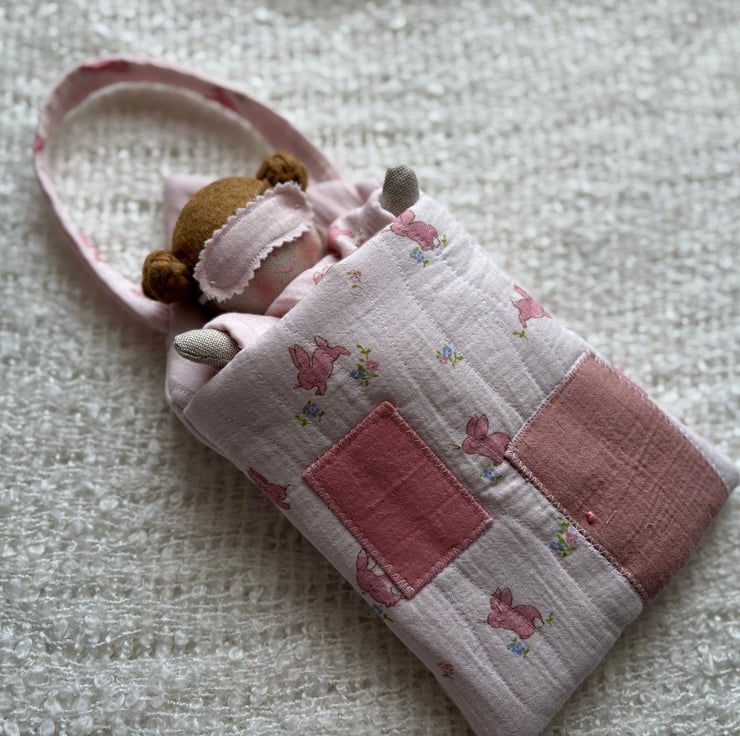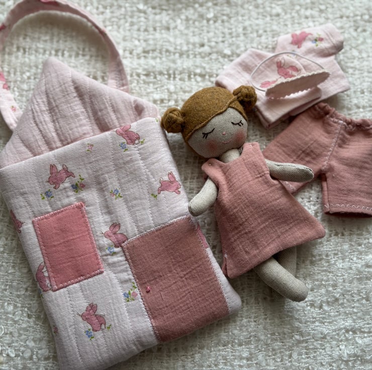 Handmade quilted dolls house bag with mini rag doll and outfits