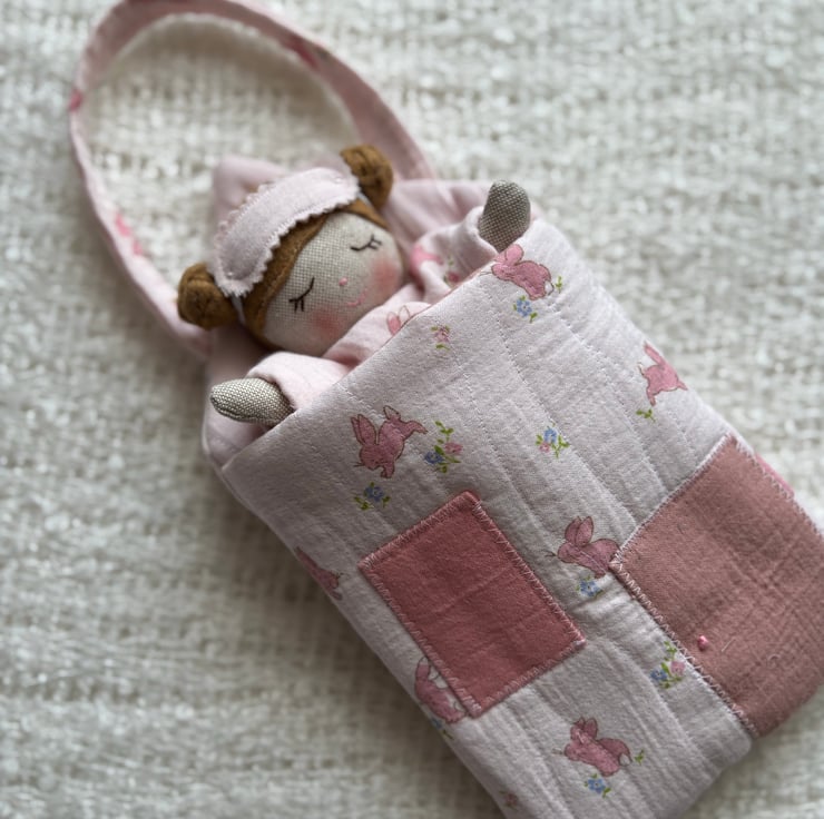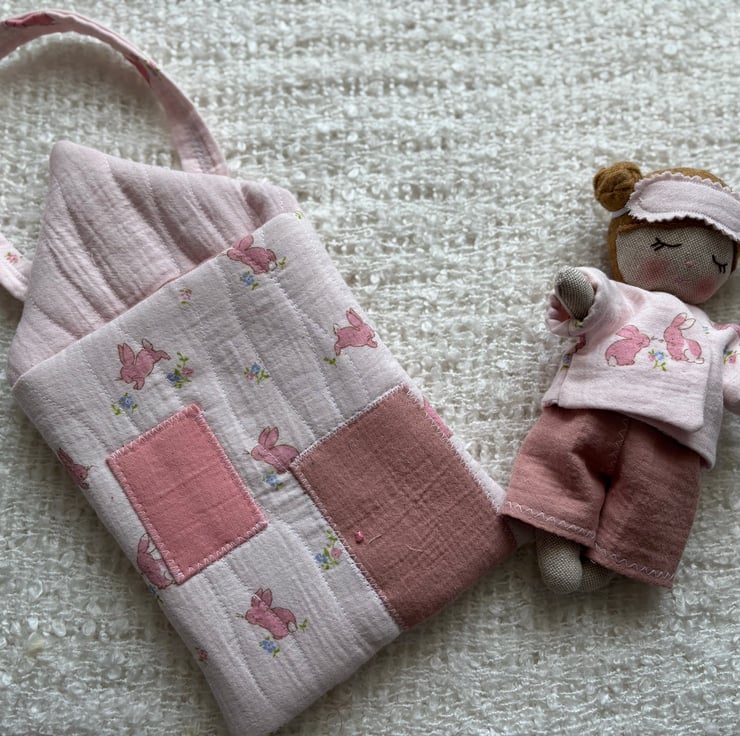 Bag is quilted back and front with a pocket in the front to carry doll and a pocket in the back to store clothes ,with little carry handle