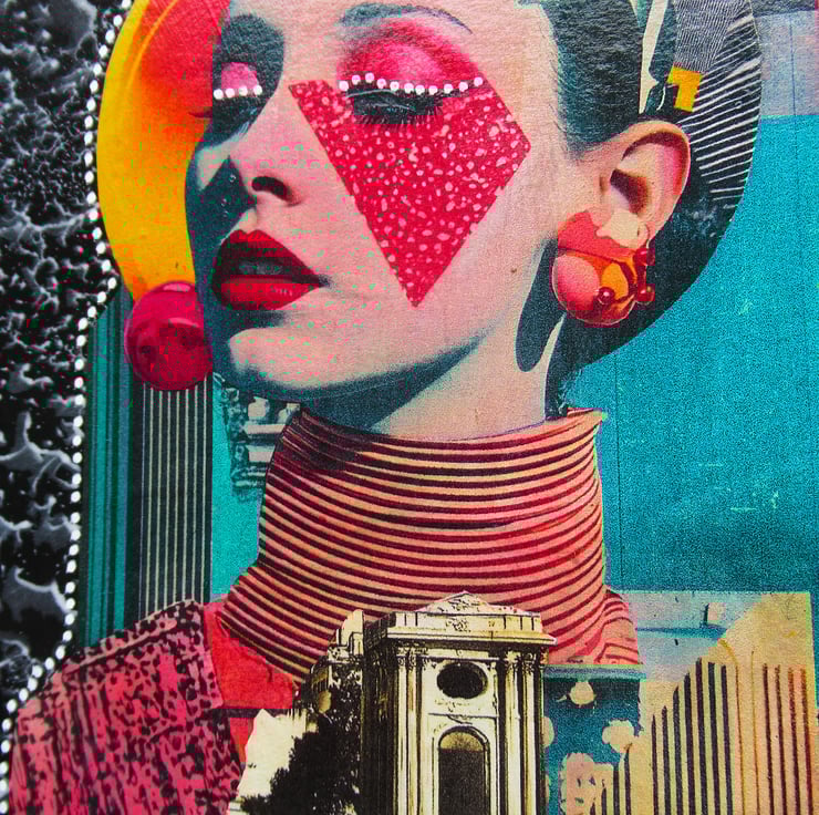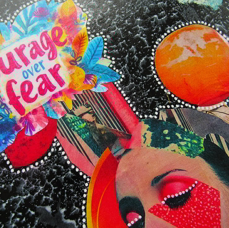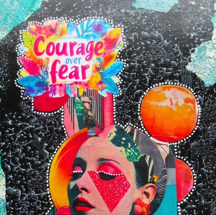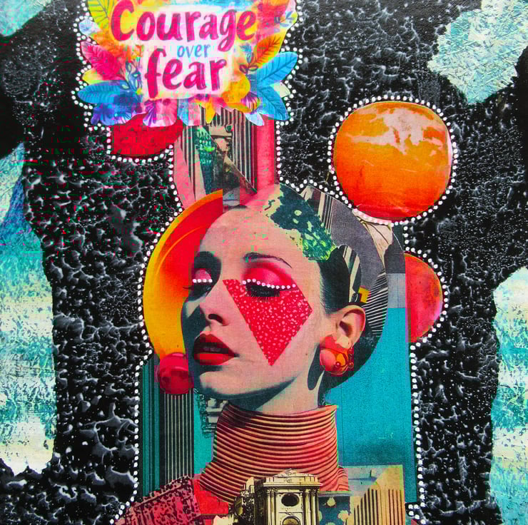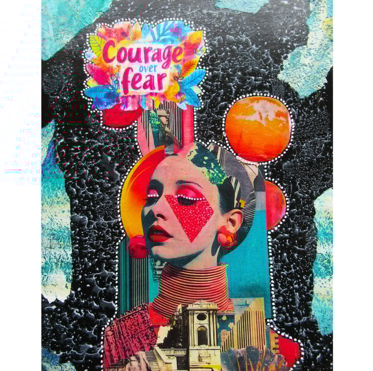 Bring vibrant energy and fearless creativity into your space with this OOAK mixed media artwork entitled Courage Over Fear. In acrylic, collage and drawing pens on 8 x 10 inch board, it features a surreal female portrait infused with bold geometric shapes, vivid colors, and layered textures. This painting is a celebration of strength, individuality, and the triumph of courage over doubt. Perfect for modern interiors, art lovers, and anyone who needs a daily reminder to choose bravery over fear. Blending retro-inspired portraiture, abstract design elements, and motivational typography to create a powerful visual statement. Perfect to place straight into any standard 8x10" frame (or mount). It will be signed on the front by Bea before shipping.