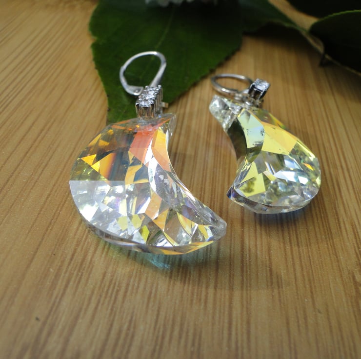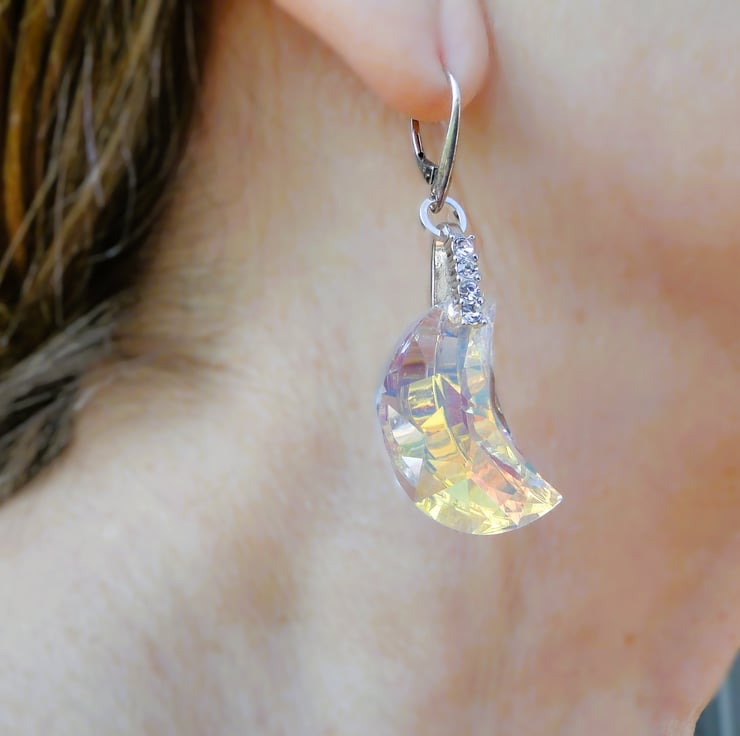 The crystals are half moon Swarovski AB crystals. One is left facing and the other is right facing. This is unusual.