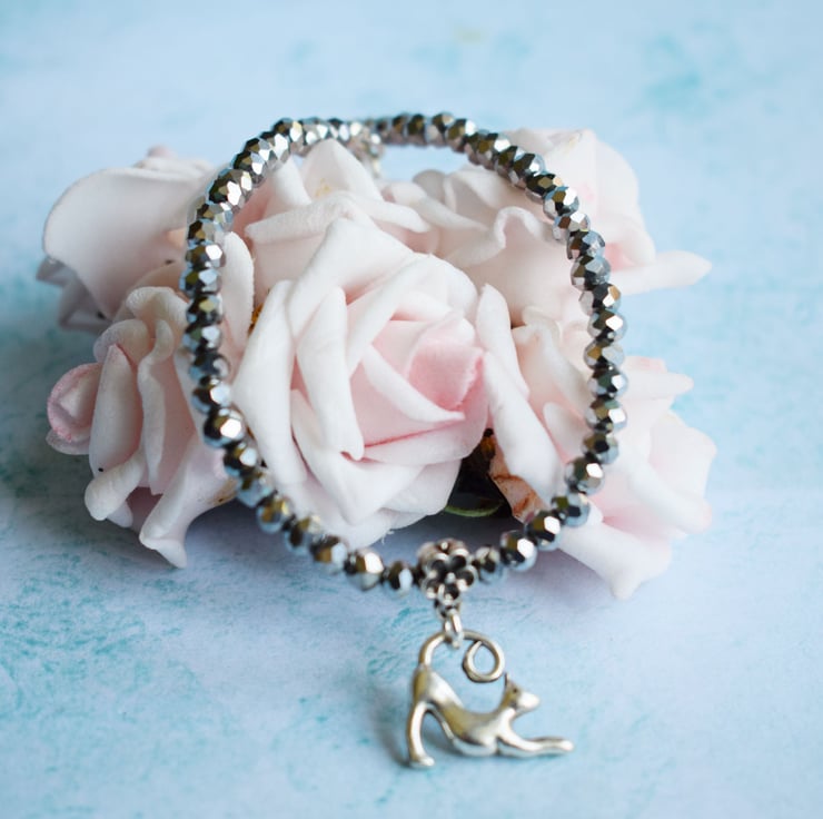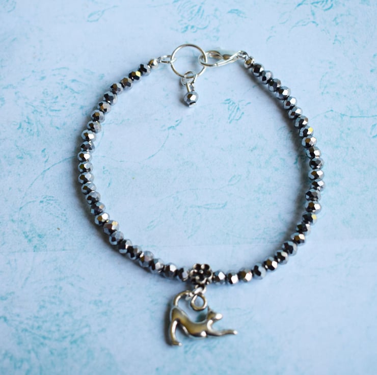 I have used some silvery faceted glass beads for this bracelet, they are nice and small so the bracelet is dainty and can be worn alone or stacked. It is finished with one of these lovely stretching cat or yoga cat charms and fastens with a lobster claw clasp.