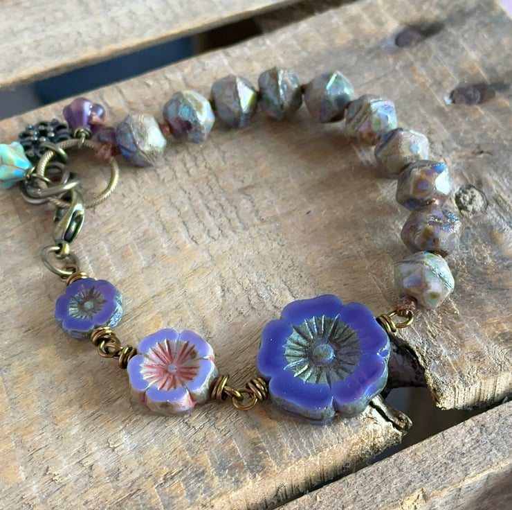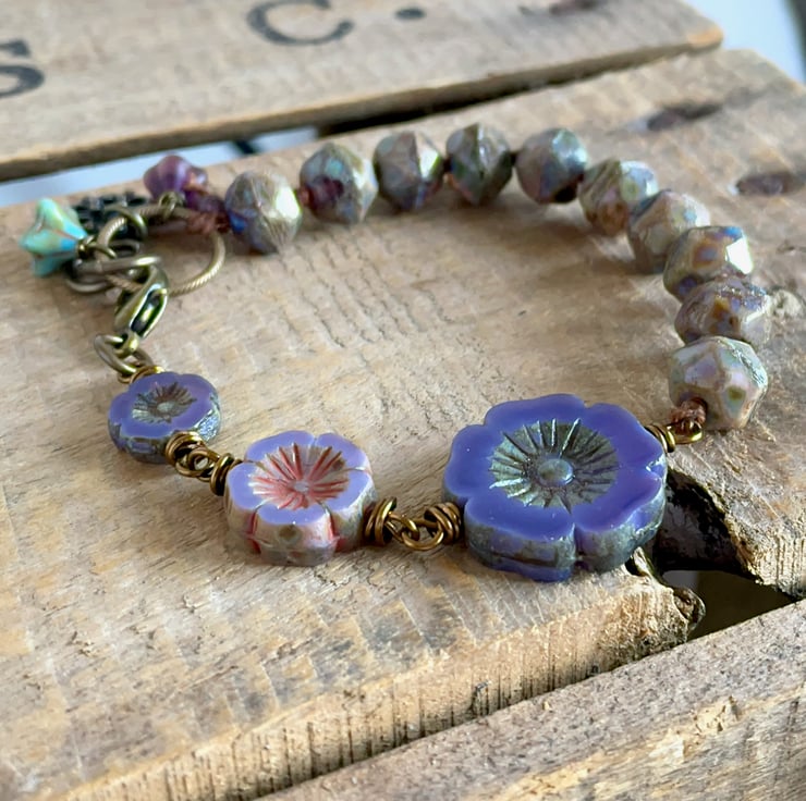 This bracelet showcases a trio of Czech glass flower beads in shades of lavender and purple. Each table-cut bead has a rustic Picasso finish that highlights its carved details, adding to its charm.