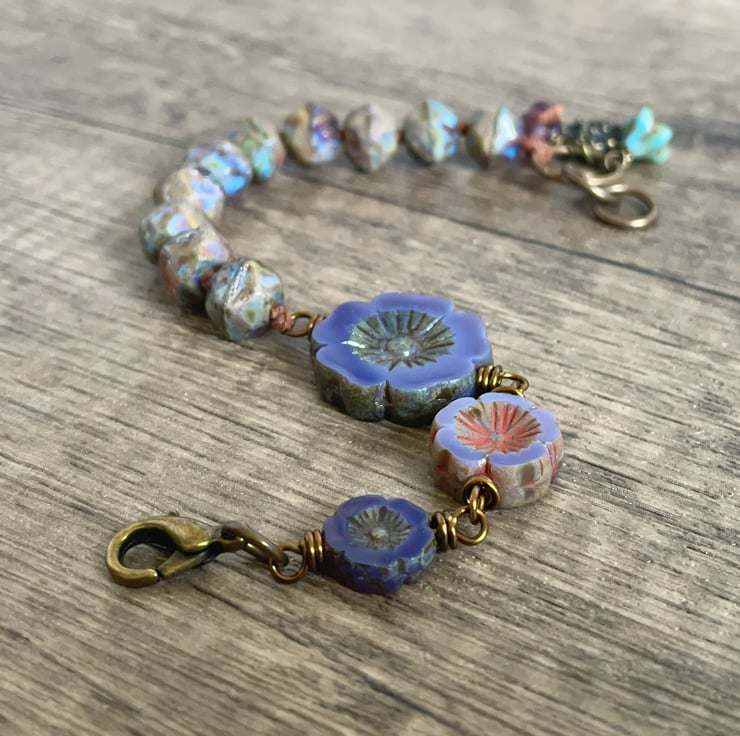 A delicate cluster of Czech glass bell flowers and a brass flower charm dangle at the end, adding the perfect bohemian touch. The bracelet fastens securely with a brass lobster clasp and measures approximately 8 inches, fitting a wrist of around 7 inches. A small extension chain provides extra adjustability if needed.