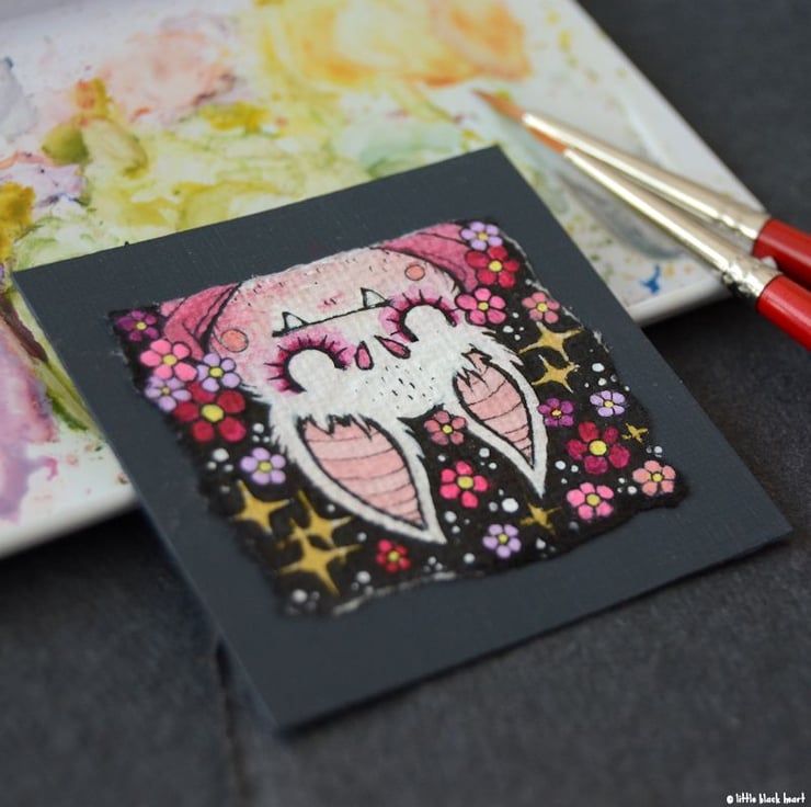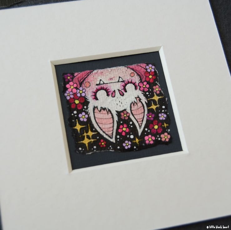 this is an original artwork in artists pens and watercolour pencils and paints, drawn on textured indian khadi paper, which is handmade from recycled cotton rag. the paper has been hand torn with an irregular edge, which I have then mounted to a twinchie painted with a paynes grey acrylic, to create a dark background.