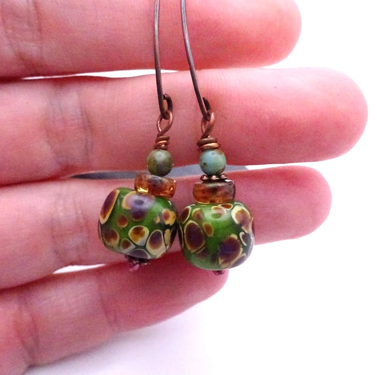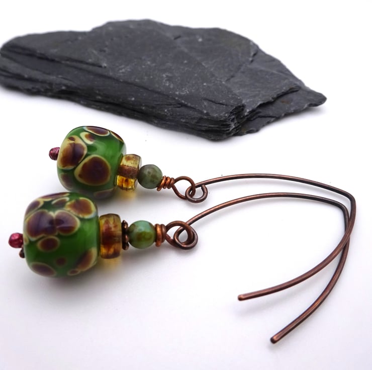 A pair of earrings made with handmade copper ear wires, Czech glass beads and handmade lampwork glass beads.