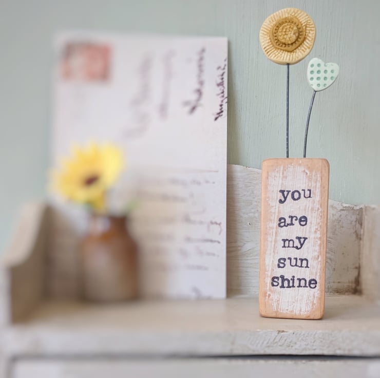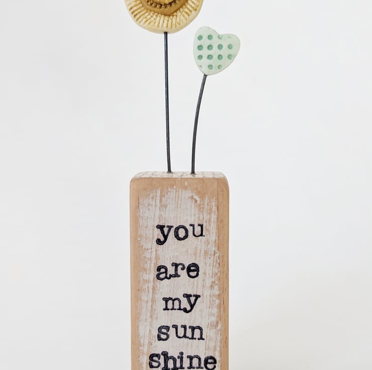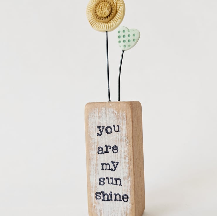 The front of the wooden block is painted white, and hand stamped with the words 'you are my sunshine'.
