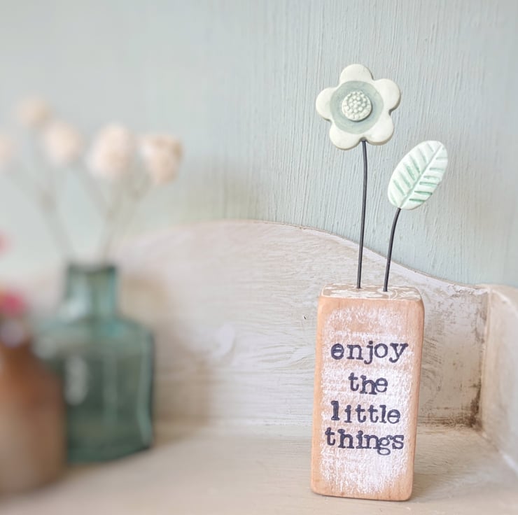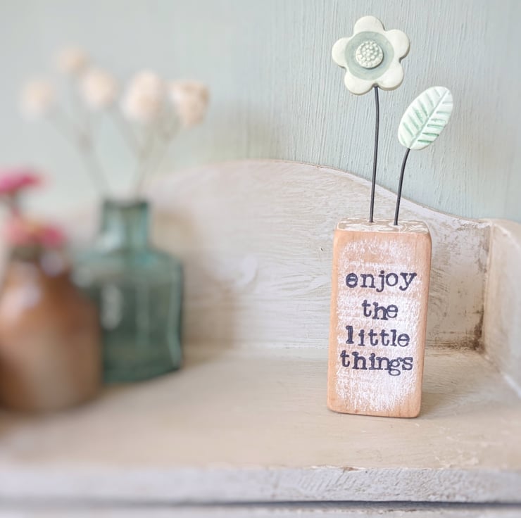 The front of the wooden block is hand stamped with the words 'enjoy the little things'.