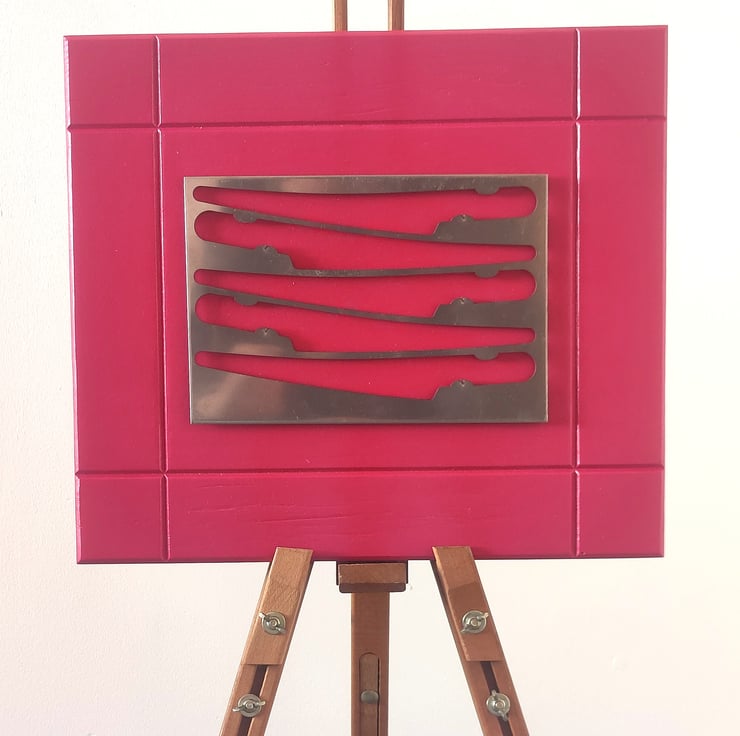 Sheffield steel knife cutout mounted on wood. Colour magenta/red. Total size approximately 380mm x 340mm.