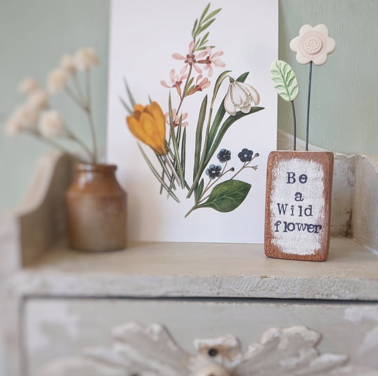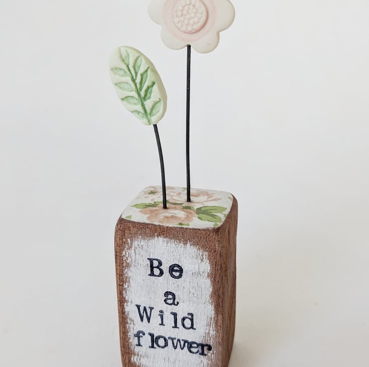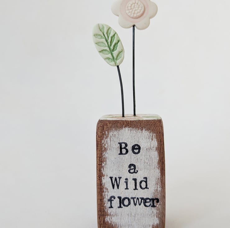 The front of the wooden block is hand stamped with the words 'Be a wild flower'