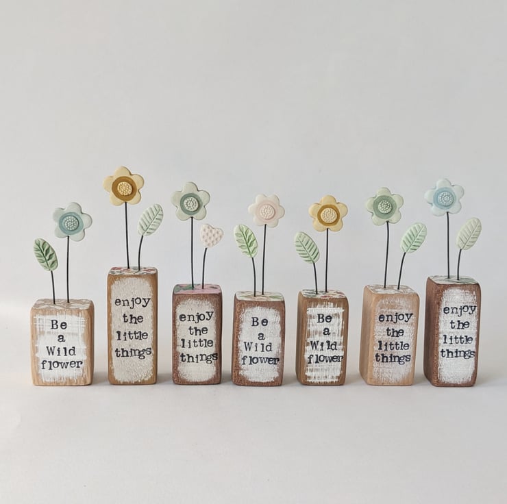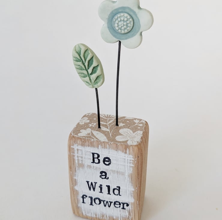 The front of the wooden block is hand stamped with the words 'Be a wild flower'