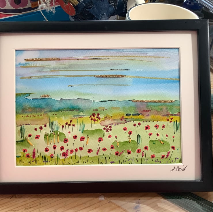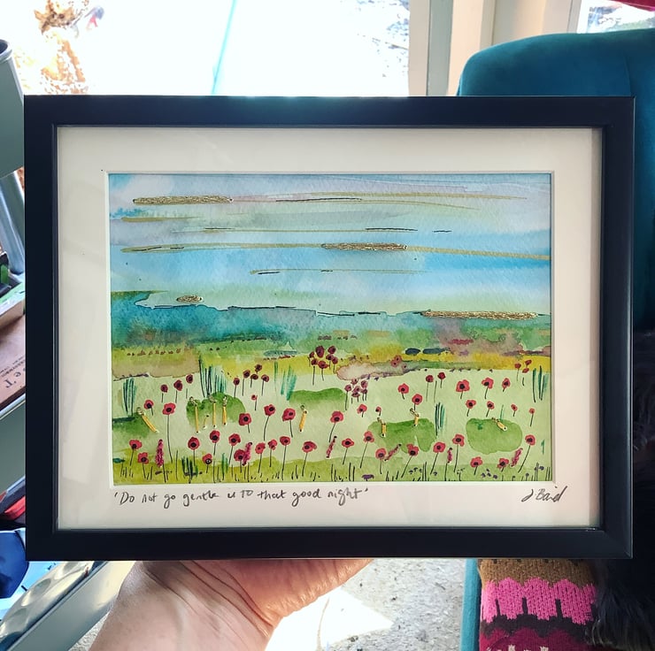 Lovely original watercolour painting with added stitching. This has been titled ‘Do not go gentle in to that good night’ from Dylan Thomas poem.