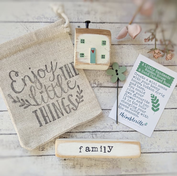 A teeny wooden house scene that you can choose to personalise with your own decoration!