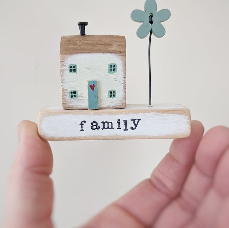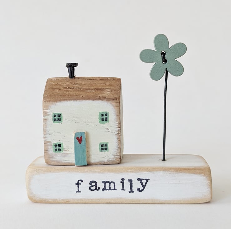 A hand stamped wooden base with a teeny painted house and a jolly flower on a wire to stand beside it.