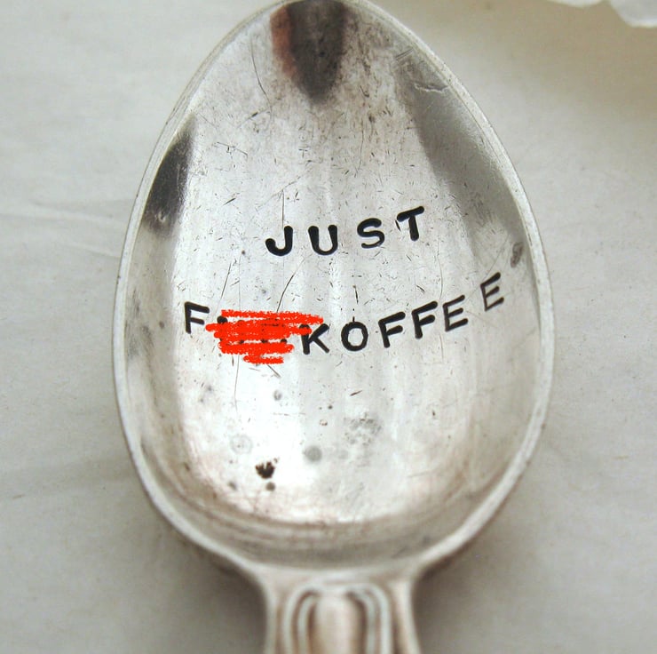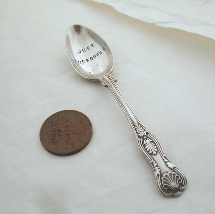 Hands up: who remembers 'The High Life'? The immortal moment where the innocent question 'You for coffee?' comes out sounding like something very rude... anyway it was the inspiration for the wording on this coffee spoon, which is indubitably very rude. It's around 12cm long, it has an ornate 'Kings Pattern' scrolly handle, it's got a few dings and spots in its silver plating and it's probably Victorian in age.