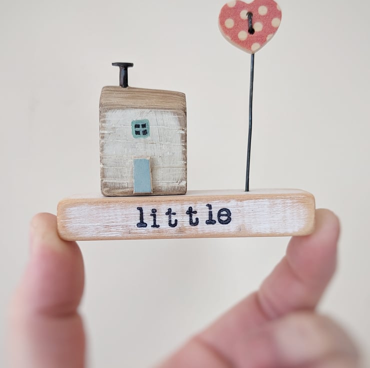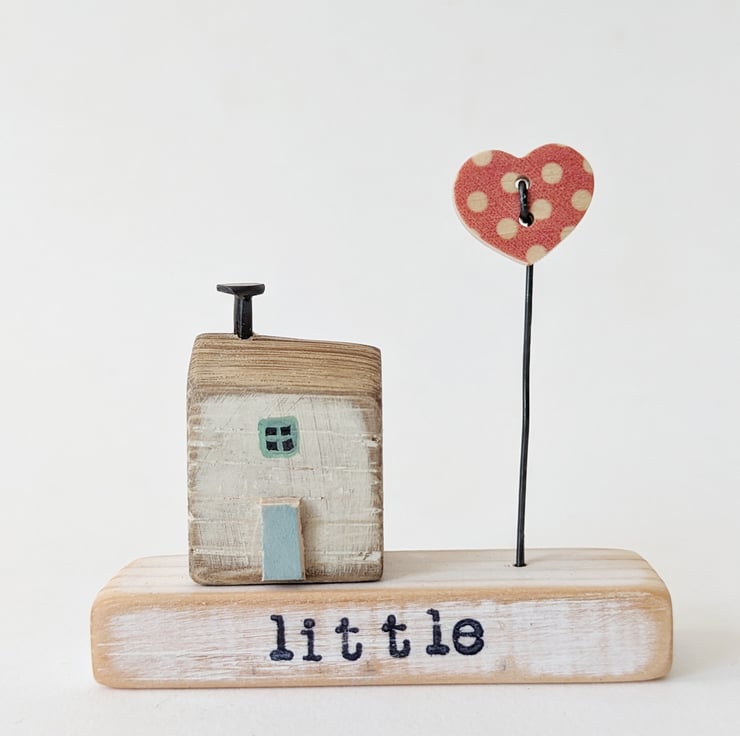 A hand stamped wooden base with a teeny painted house and a jolly heart on a wire to stand beside it.