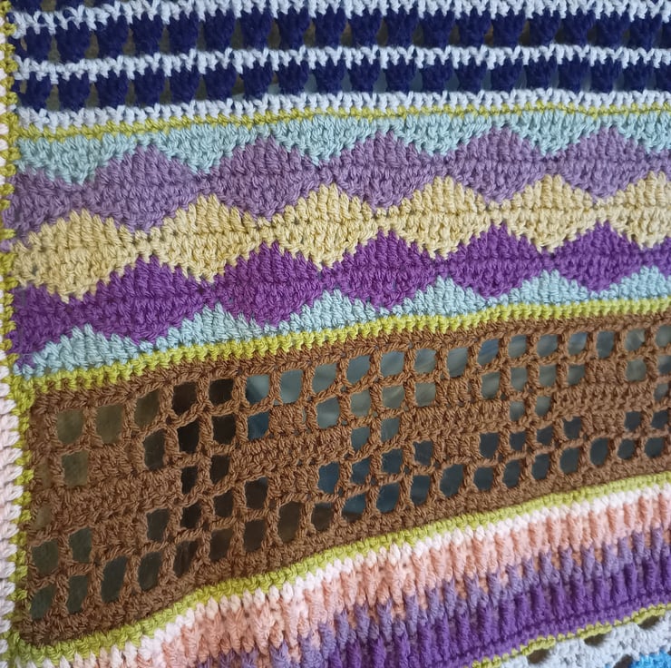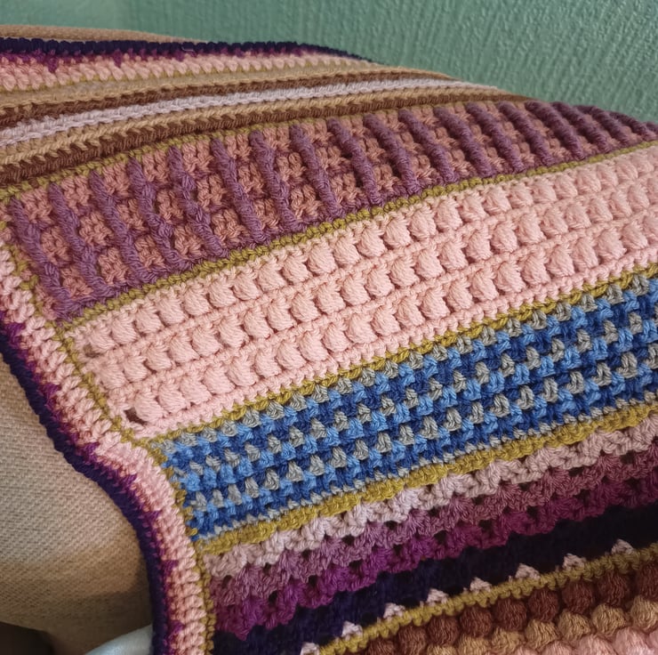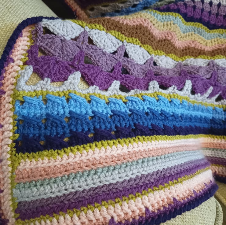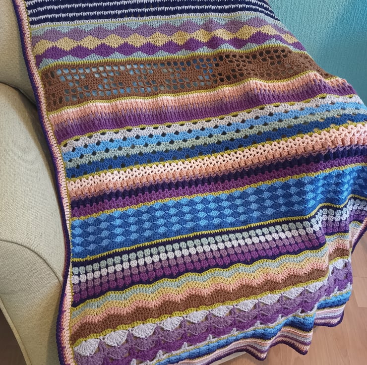 Unique, one off crochet sampler blanket showcasing lots of different crochet stitches in a variety of colours that blend together seamlessly.