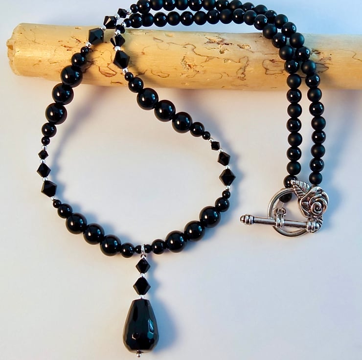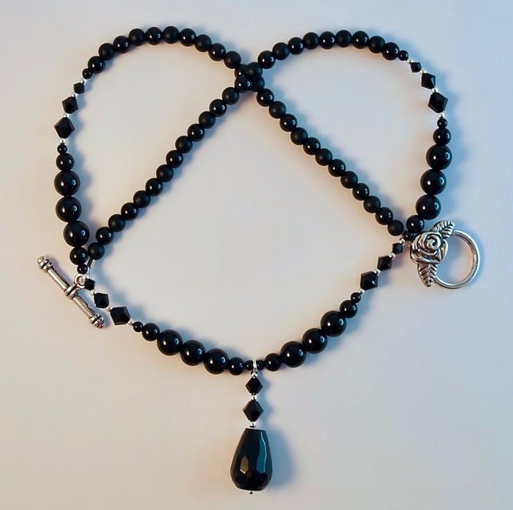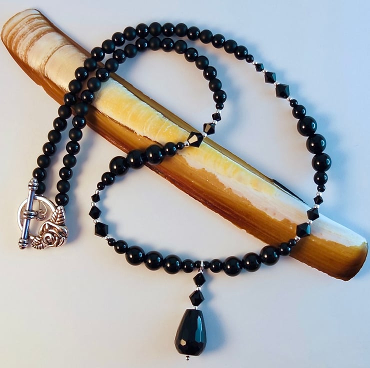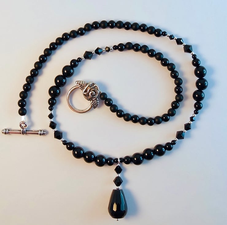 This is set between a framework of 6, 4 and 2mm polished round Black Onyx beads and trios of 5, 4 and 3mm quality Austrian 'jet' crystals, separated by sterling silver spacers.