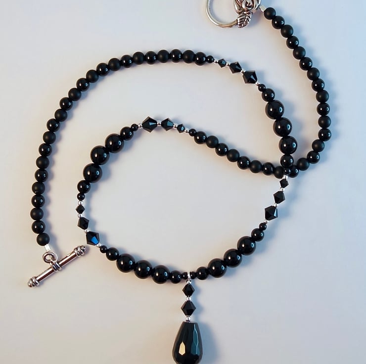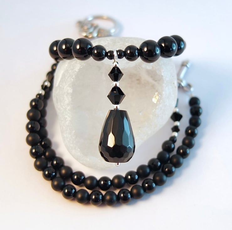 The centrepiece features a handmade pendant, a 14x10mm faceted Black Onyx teardrop topped with a 5mm and 4mm quality Austrian crystal in the colour 'jet', separated by tiny 1.8mm sterling silver round beads and threaded onto sterling silver wire.