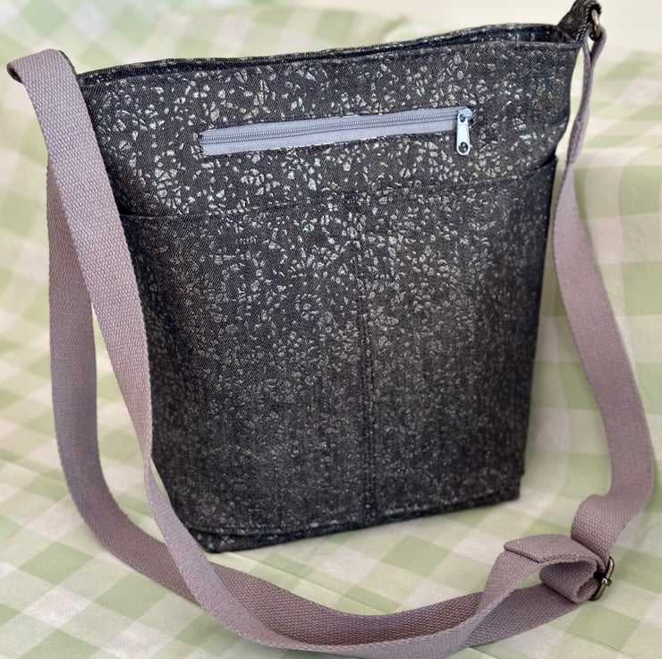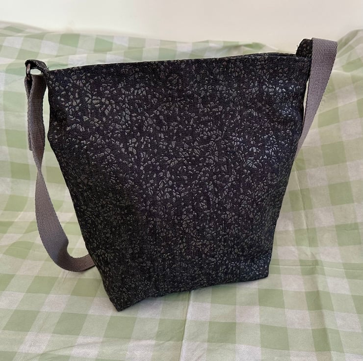 A very practical crossbody handbag. The outer is made using an embossed dark grey denim.