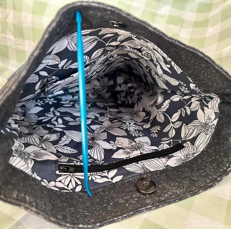 The lining of the bag is made from a grey cotton fabric, with a large floral pattern.