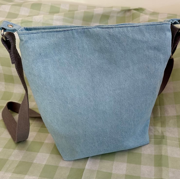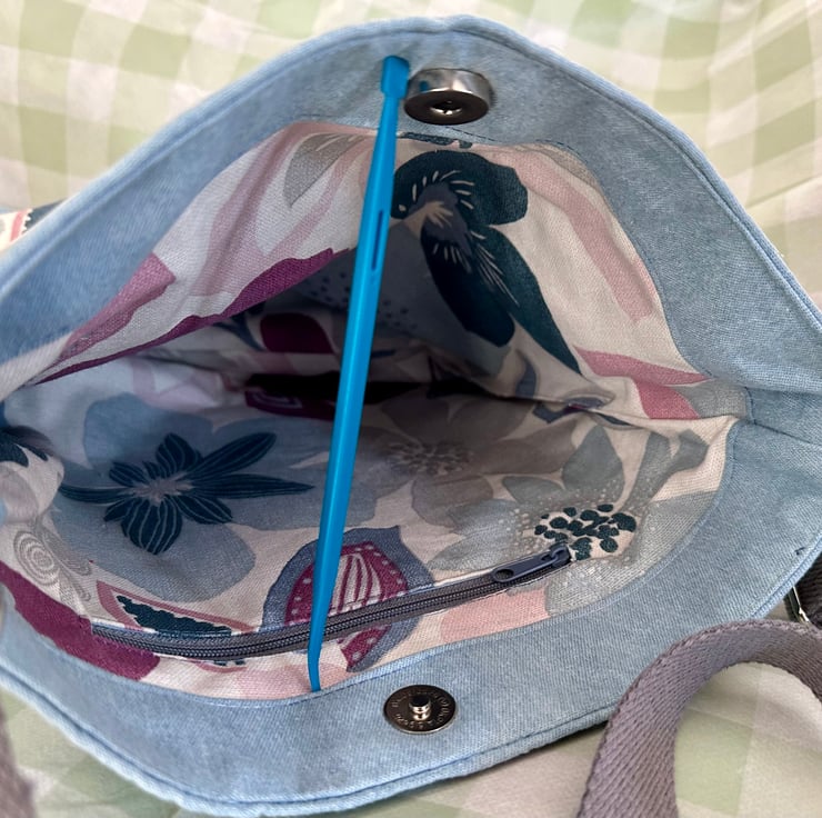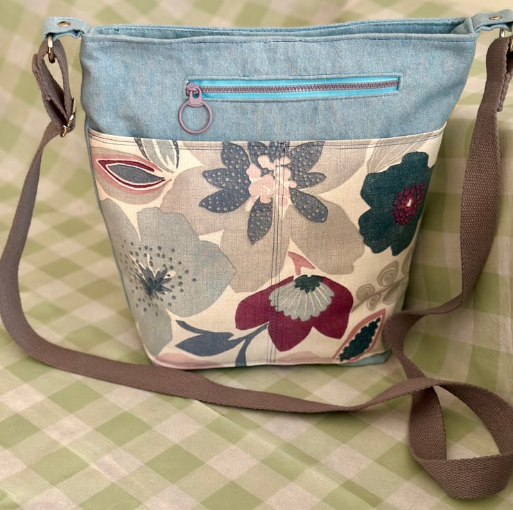 A very practical crossbody handbag. The outer is made using denim and canvas. The denim is a lightweight cotton washed denim in light blue. The canvas features a gorgeous print of large flowers in mauves and blue greys.