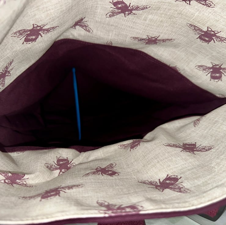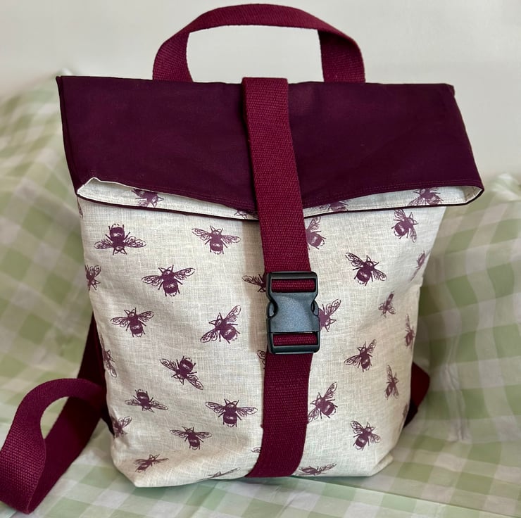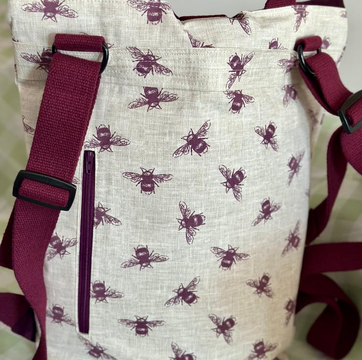 This rucksack is very large and roomy. It will easily accommodate you for a weekend trip away. The rucksack is made using two different but complementary canvas fabrics. The plain canvas is a rich deep plum colour which perfectly complements the purple of the bees on the feature fabric. The back of the bag has a zipper compartment, which rests against your back whilst the bag is being worn, so it's protected from pickpockets.