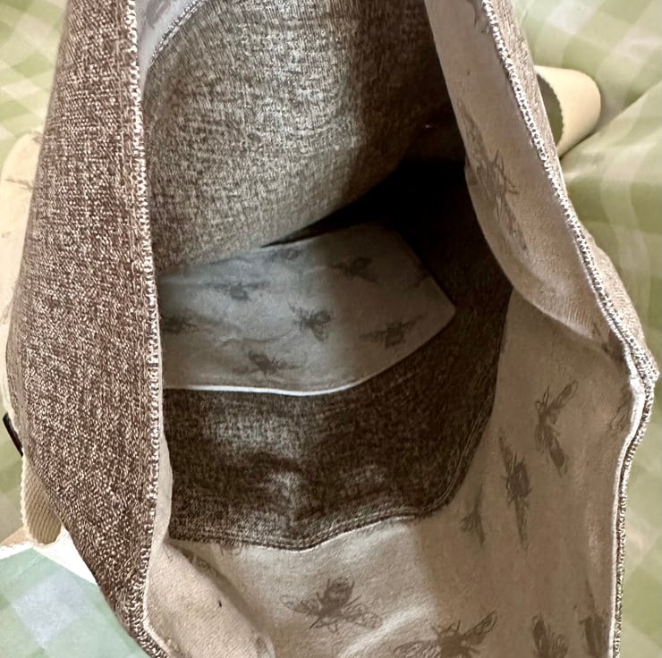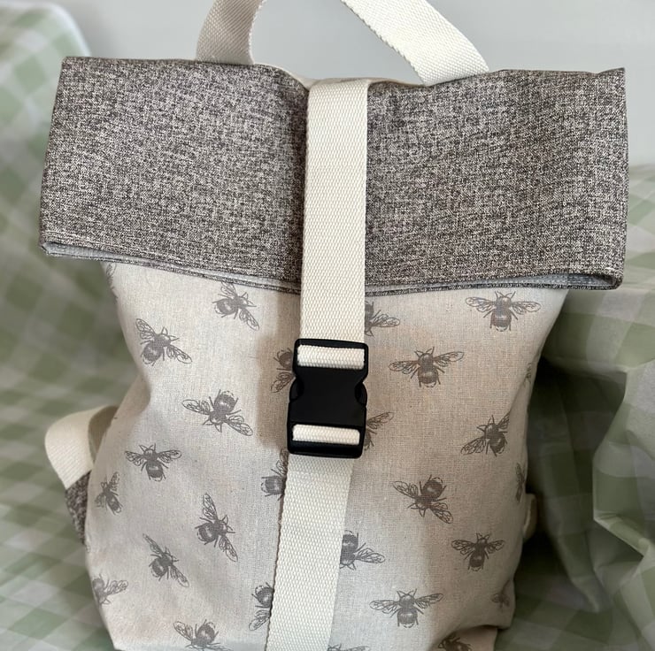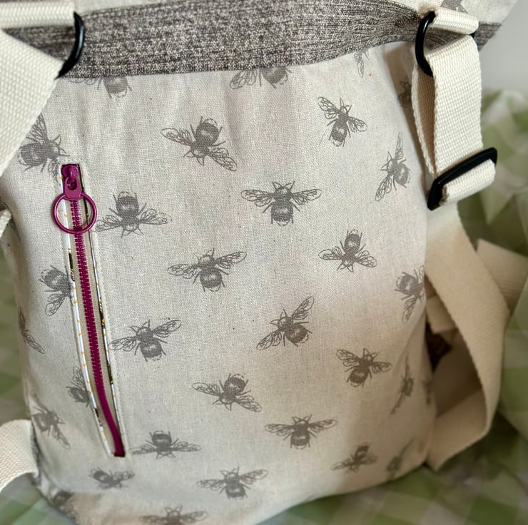 This rucksack is very large and roomy. It will easily accommodate you for a weekend trip away. The rucksack is made using two different but complementary canvas fabrics. The plain canvas is a mottled brown colour which perfectly complements the natural tones of the bee feature fabric. The back of the bag has a zipper compartment, which rests against your back whilst the bag is being worn, so it's protected from pickpockets.
