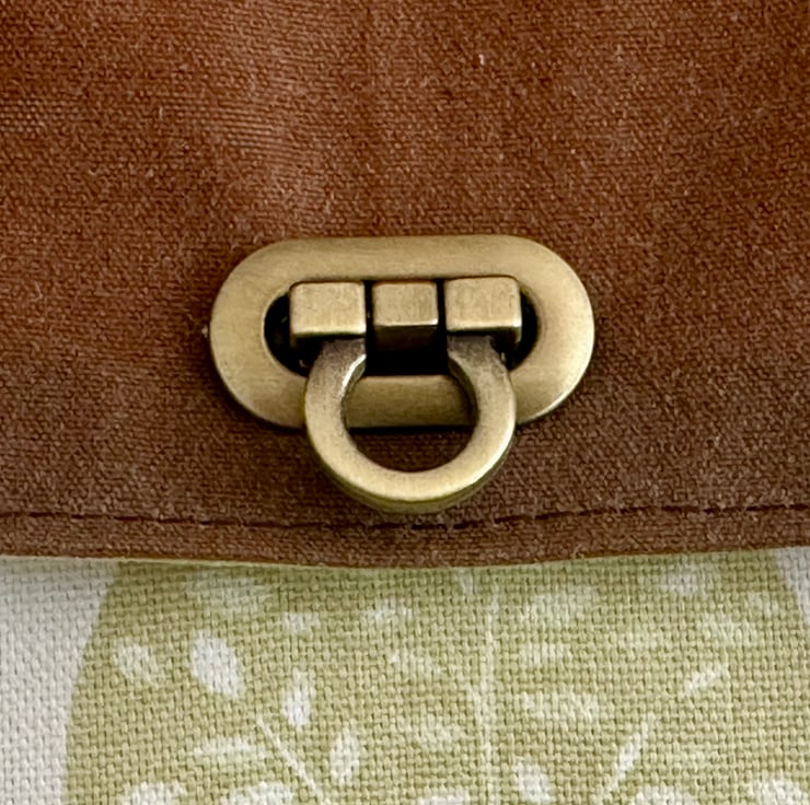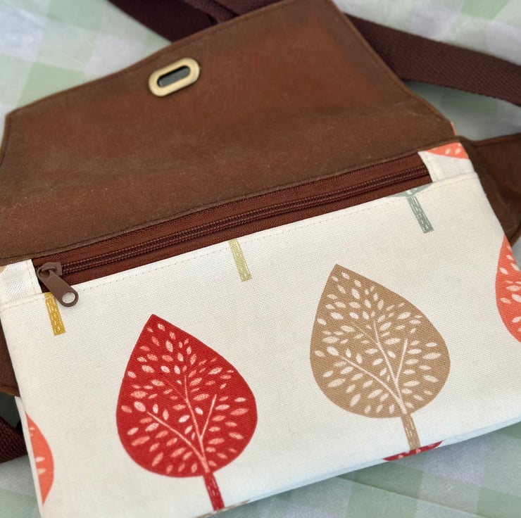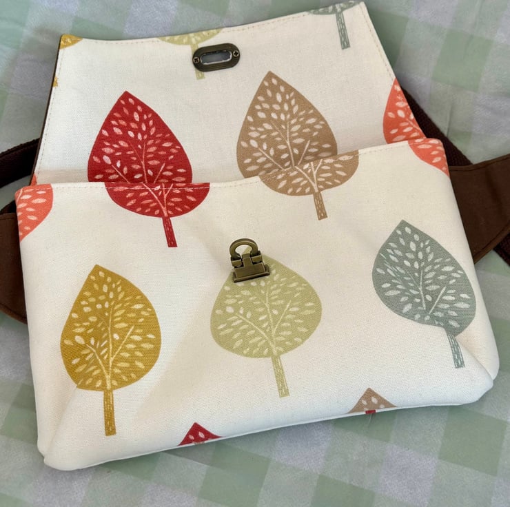 The outer is made from a combination of brown waxed canvas and a symmetrical leaves canvas print. The lining is made from the same canvas fabric. The strap is made from cotton webbing.