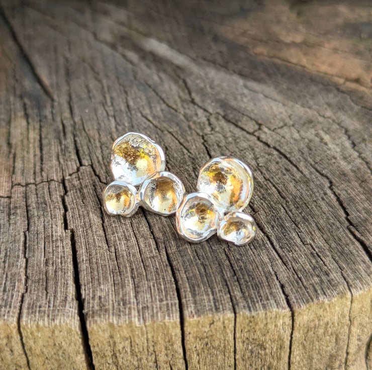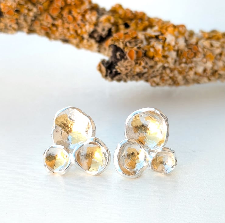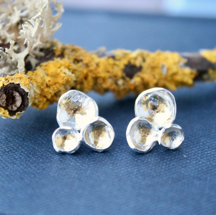These delicate sterling silver stud earrings are inspired by the intricate forms of lichen found in nature. Each pair features a cluster of three organically shaped lichen forms in varying sizes, just as they would grow nestled together in the wild.