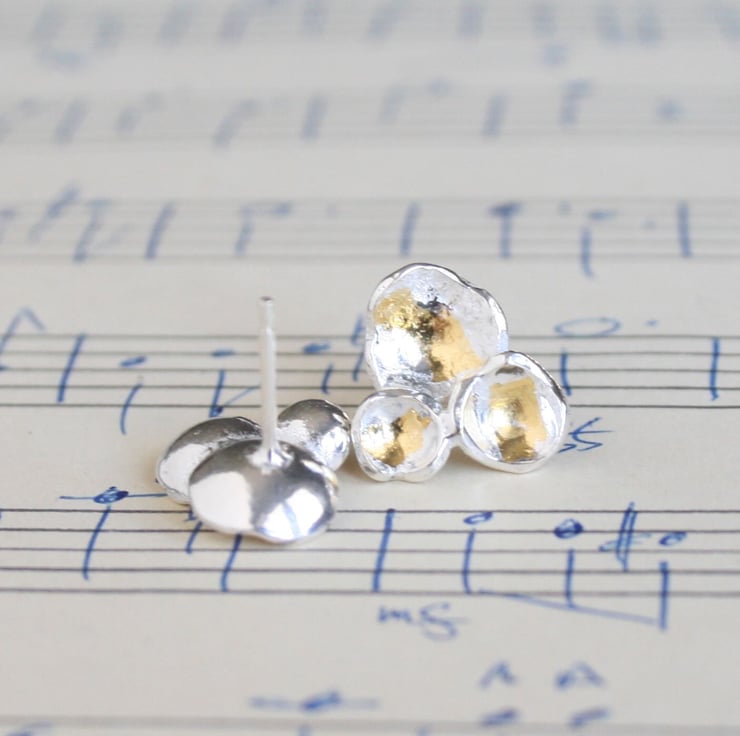 Handcrafted using recycled sterling silver and adorned with 24ct gold foil applied using the ancient Korean keum boo technique, these earrings combine natural textures with a subtle golden shimmer.
