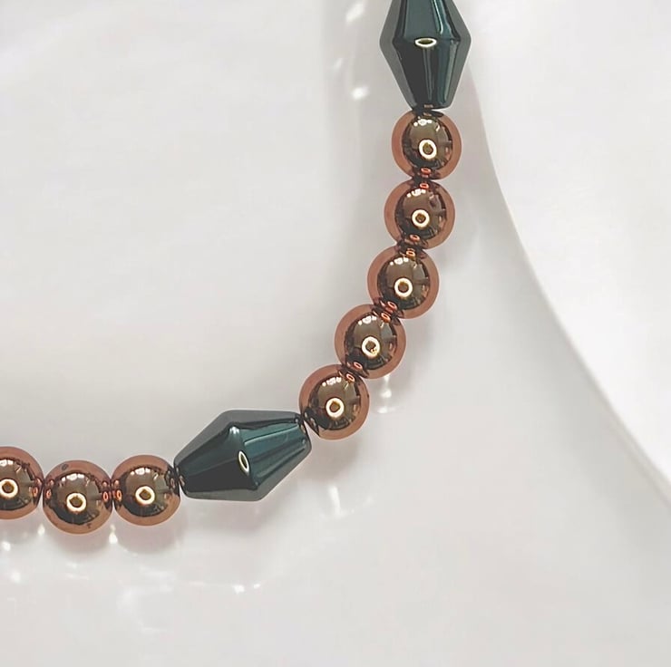Elevate your style and energy with our handmade Unisex Stretch Bracelet, featuring striking black Natural Hematite bicones and eye-catching copper-plated Hematite round beads. Measuring 8.5 inches, this bracelet will complement any outfit. Hematite is renowned for its grounding properties, offering protection and helping to block distractions while enhancing concentration. Experience emotional healing, boost your motivation, and achieve your goals with this stylish accessory that also aids in detoxification and manifesting your dreams. Make a statement while harnessing the power of Hematite!