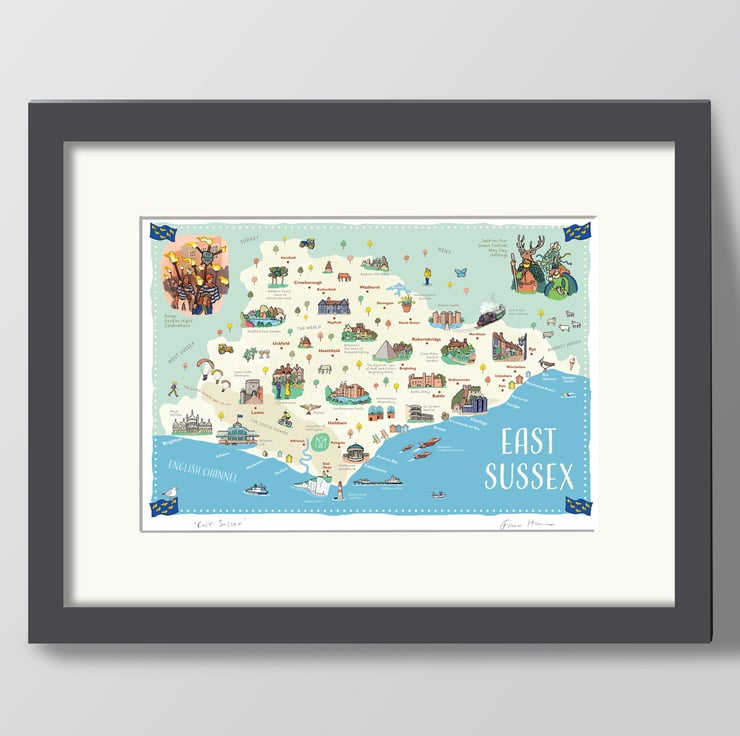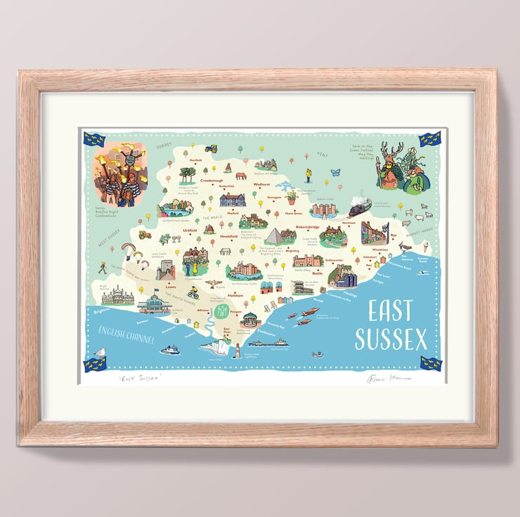Beautiful illustrated A4 wall map of the English county of East Sussex, famed for lively Brighton, and the beautiful South Downs.