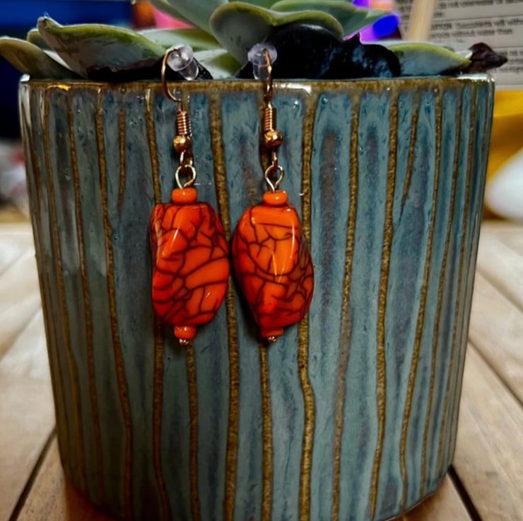 One off set of beautiful orange crackled large, twisted bead earrings that have been designed and handmade by myself.