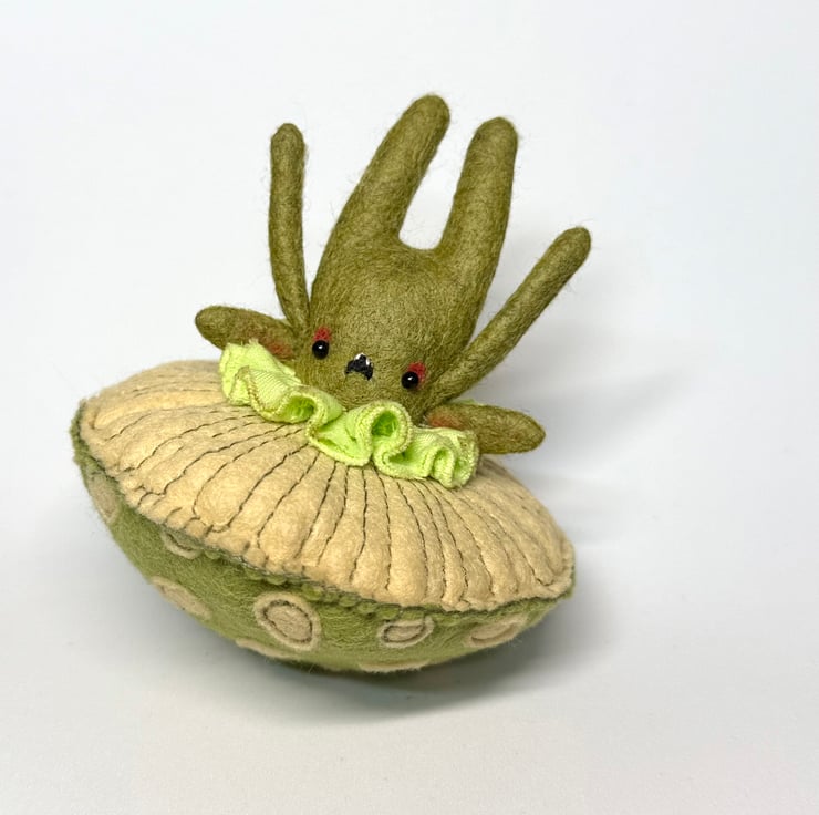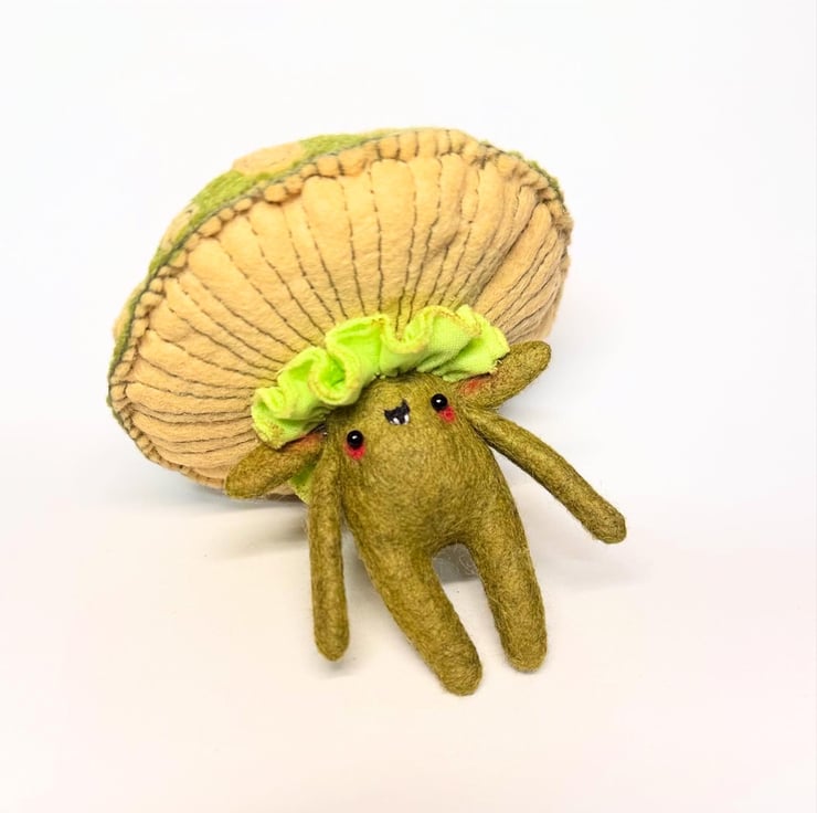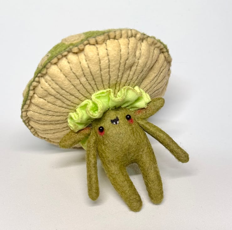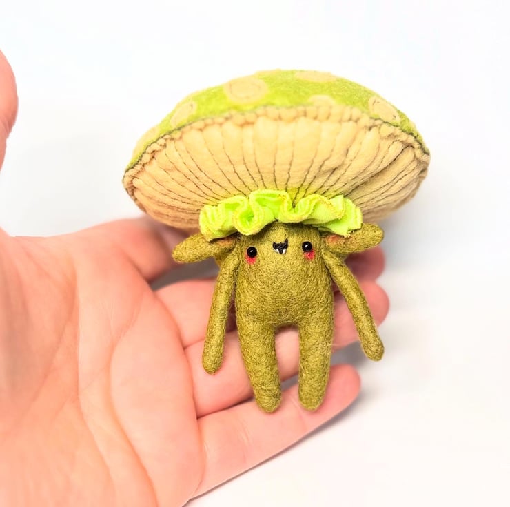 Felt art doll with glass bead eyes and waxed cheeks and ears. Mouth and teeth are hand embroidered. Doll has Lacey frill sewn into place. The cap has free motion embroidered spots on the top and gills to the bottom, the top and bottom are hand sewn together and the doll measures roughly 10cm tall. Can come with a transparent loop hanger, just choose from the options.