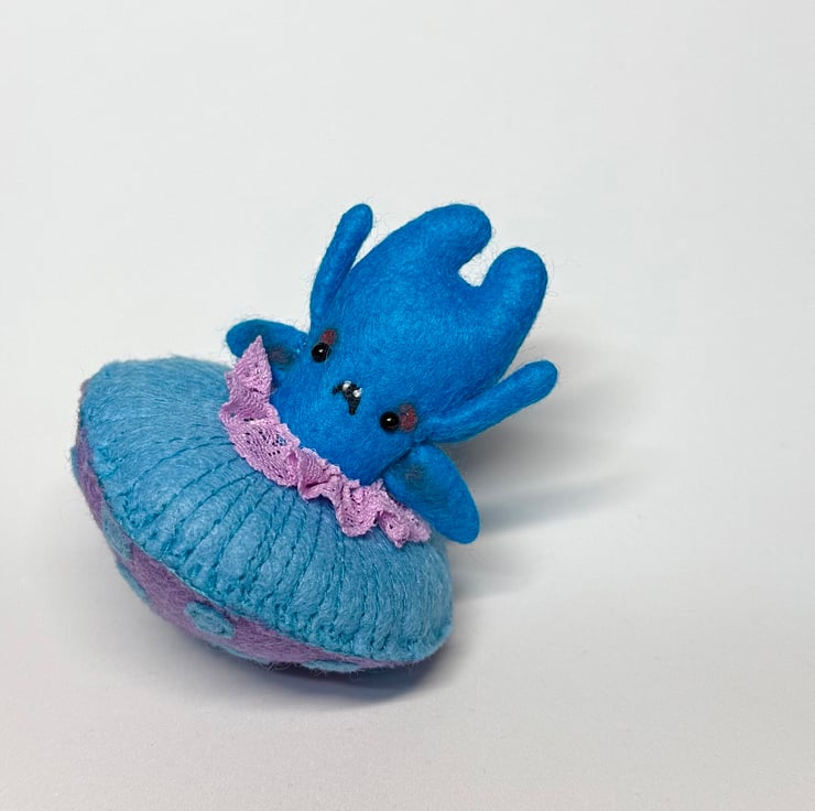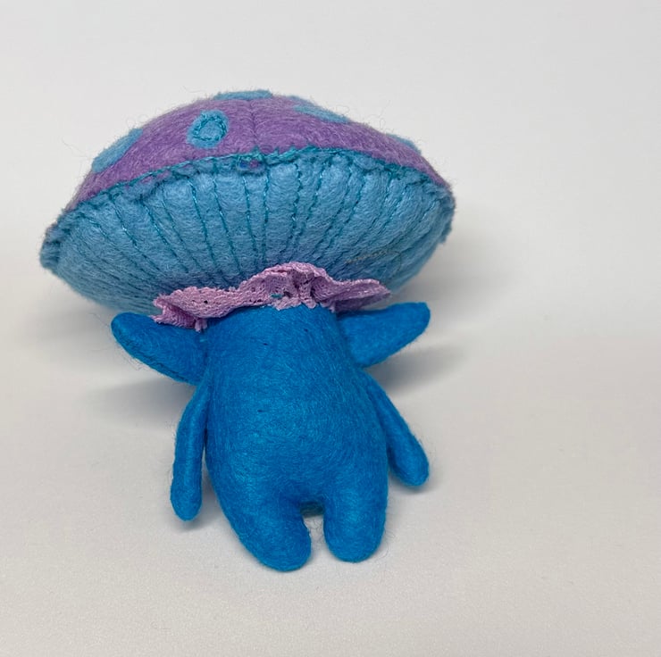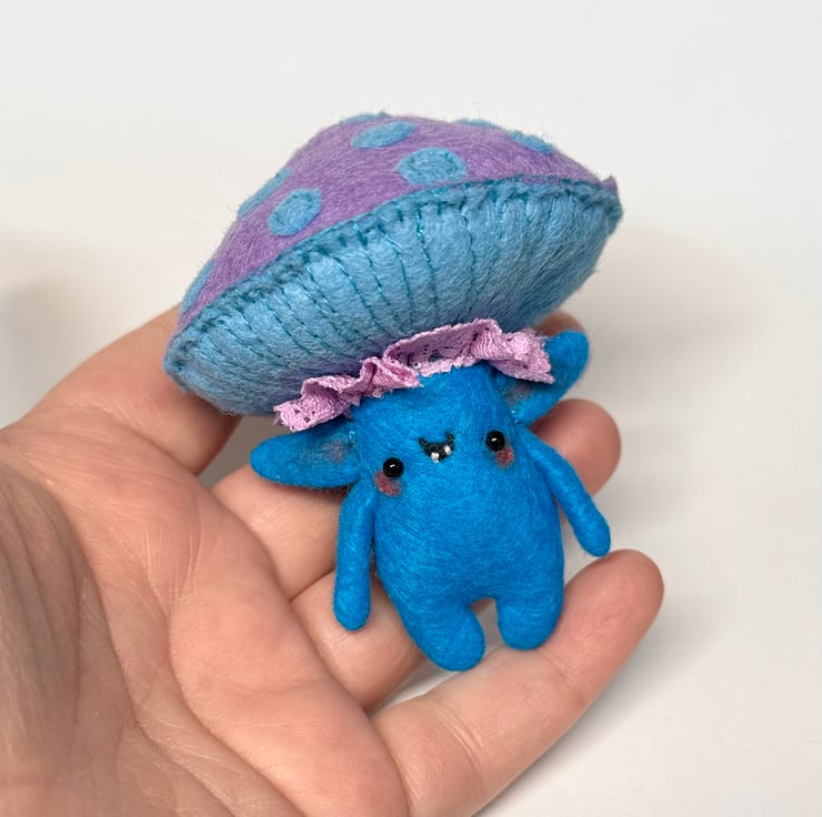 Felt art doll with glass bead eyes and waxed cheeks and ears. Mouth and teeth are hand embroidered. Doll has lace trim frill sewn into place. The cap has free motion embroidered spots on the top and gills to the bottom, the top and bottom are hand sewn together and the doll measures roughly 8cm tall. Can come with a transparent loop hanger, just choose from the options.