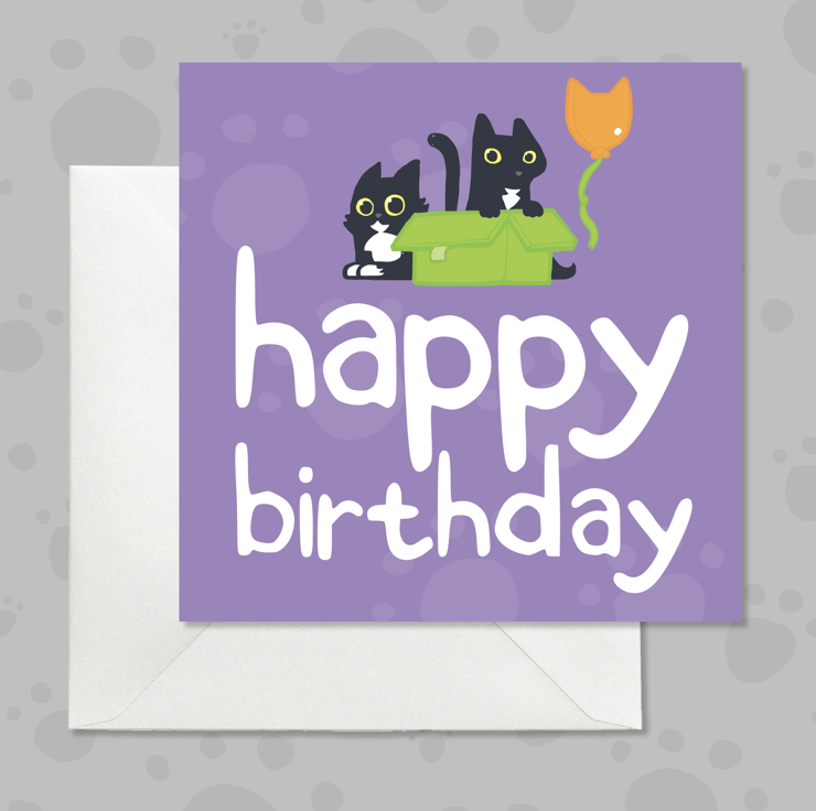 Celebrate a purrfect birthday with this funny and sweet cat birthday card, ideal for any cat lover. Featuring a playful black cat sitting in a green gift box beside an orange heart-shaped balloon and a tuxedo cat, all set against a vibrant purple background with bold white “Happy Birthday” text and pale pawprints. Printed on premium semi-gloss 350gsm cardstock, blank inside, and comes with an ivory envelope. A charming birthday card for cat lovers of all ages.
