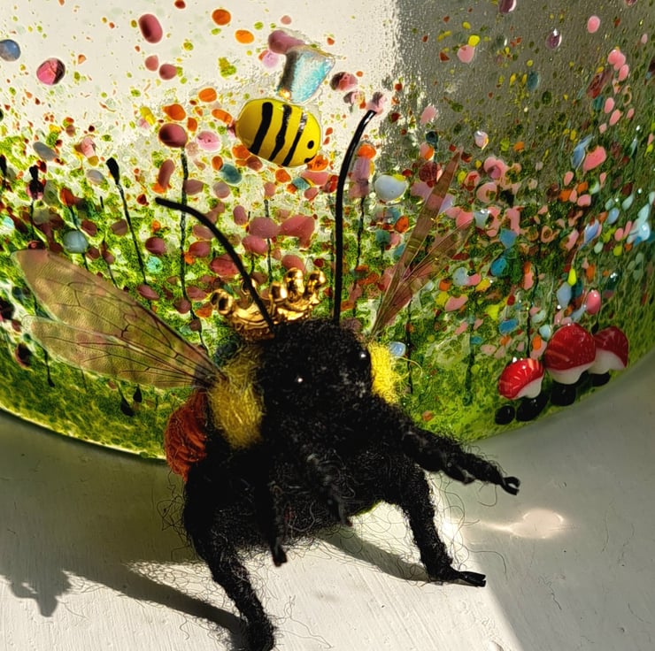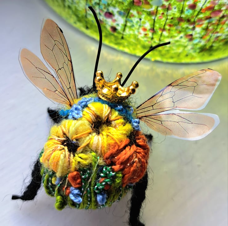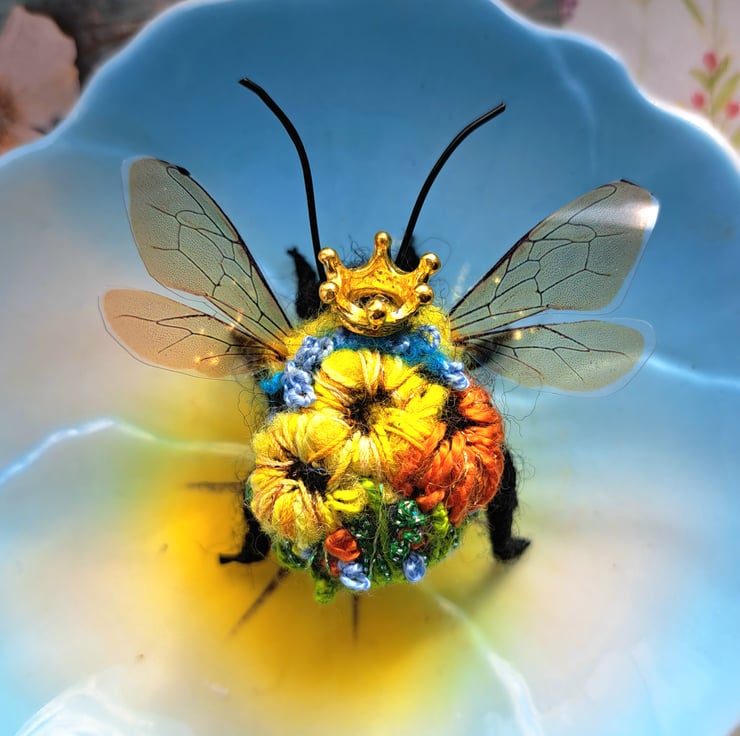Needle felted and embroidered queen bee,,complete with tiny crown. measures approx 3 cm long by 5cm wide .Your bee will come with a fine gold hanging thread ,which can be snipped off if not required,Gift box included.This is actual bee you will purchase.