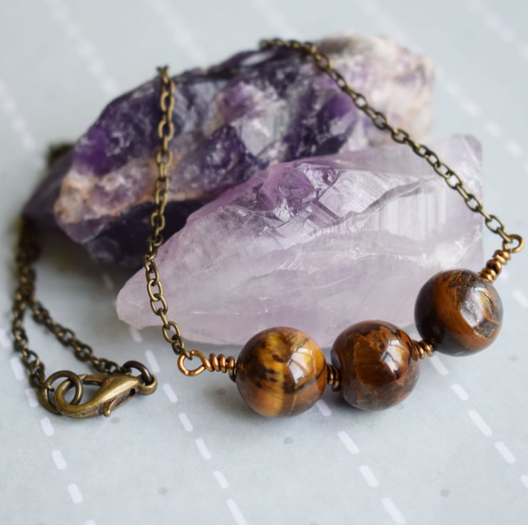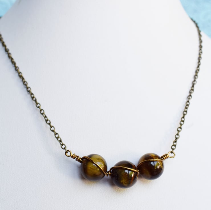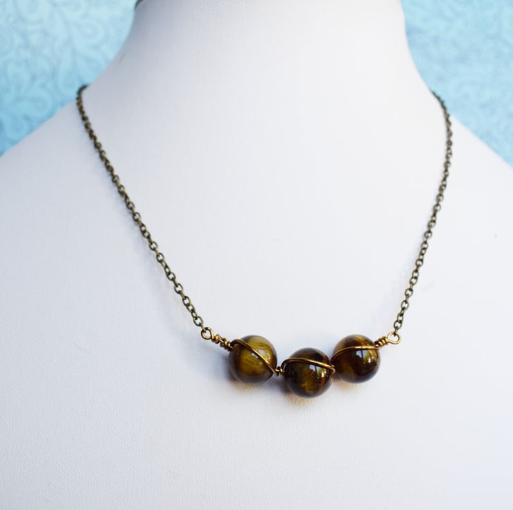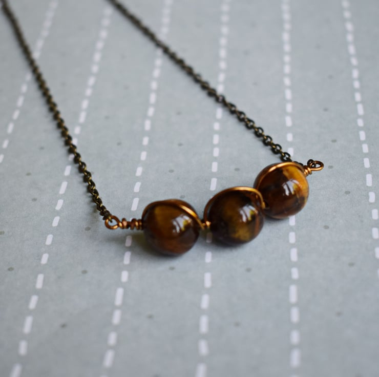 So this is a minimalist style tiger eye bar necklace but with a little twist as instead of just a few beads in a row these beautiful tiger eye beads have been wire wrapped in a spiral pattern allowing them to be rotated which is great if you love to fiddle with your necklace while wearing it!