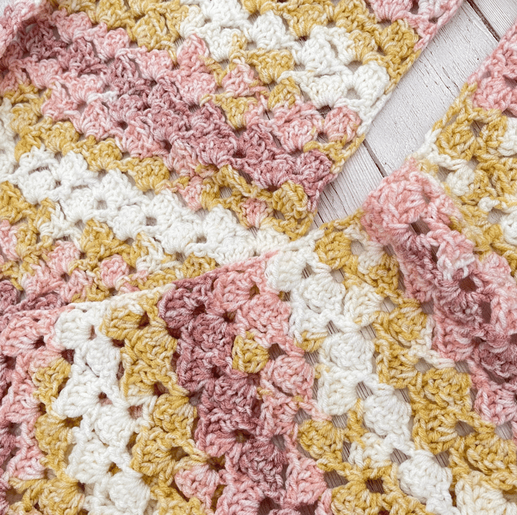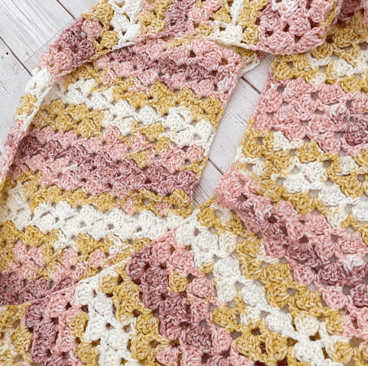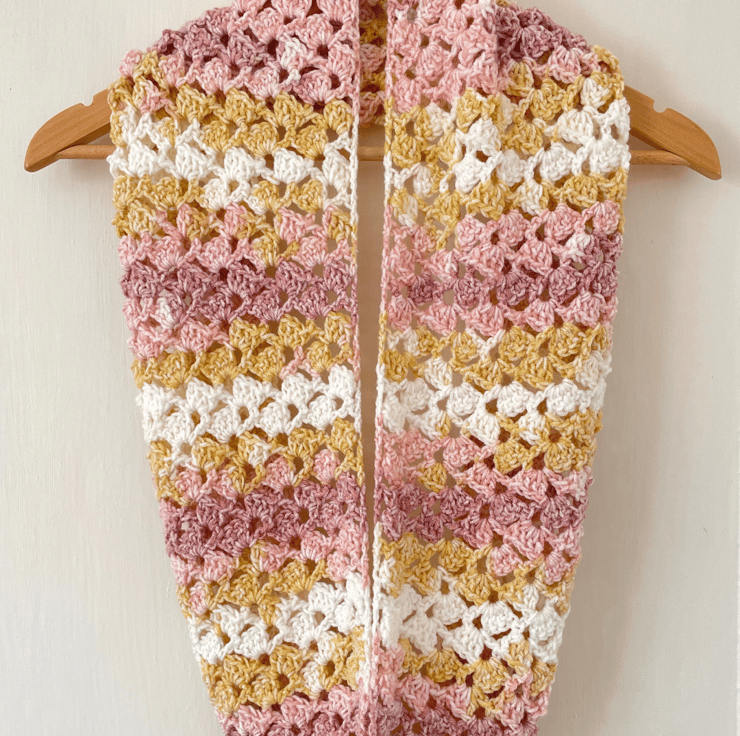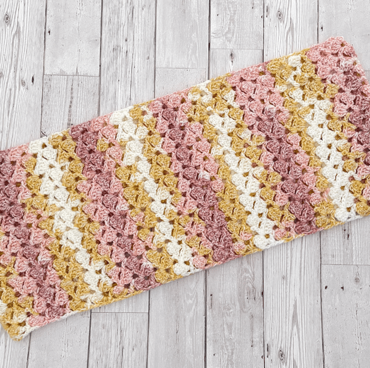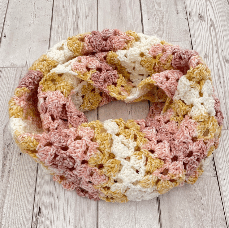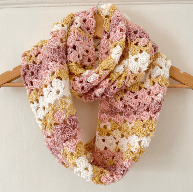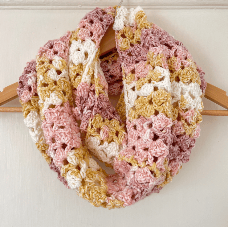 I have crocheted the scarf in an infinity style and the two ends have been joined to create a continuous loop. I used a variegated double knit yarn in shades of mustard yellow, dusky pink, rose pink and cream to create the finished piece.